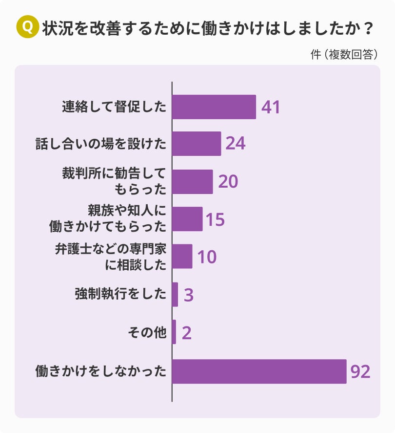 一方で、「裁判所に勧告してもらった」、「弁護士などの専門家に相談した」、「強制執行をした」といった第三者の介入を選ばれた方も一定数いるようです。