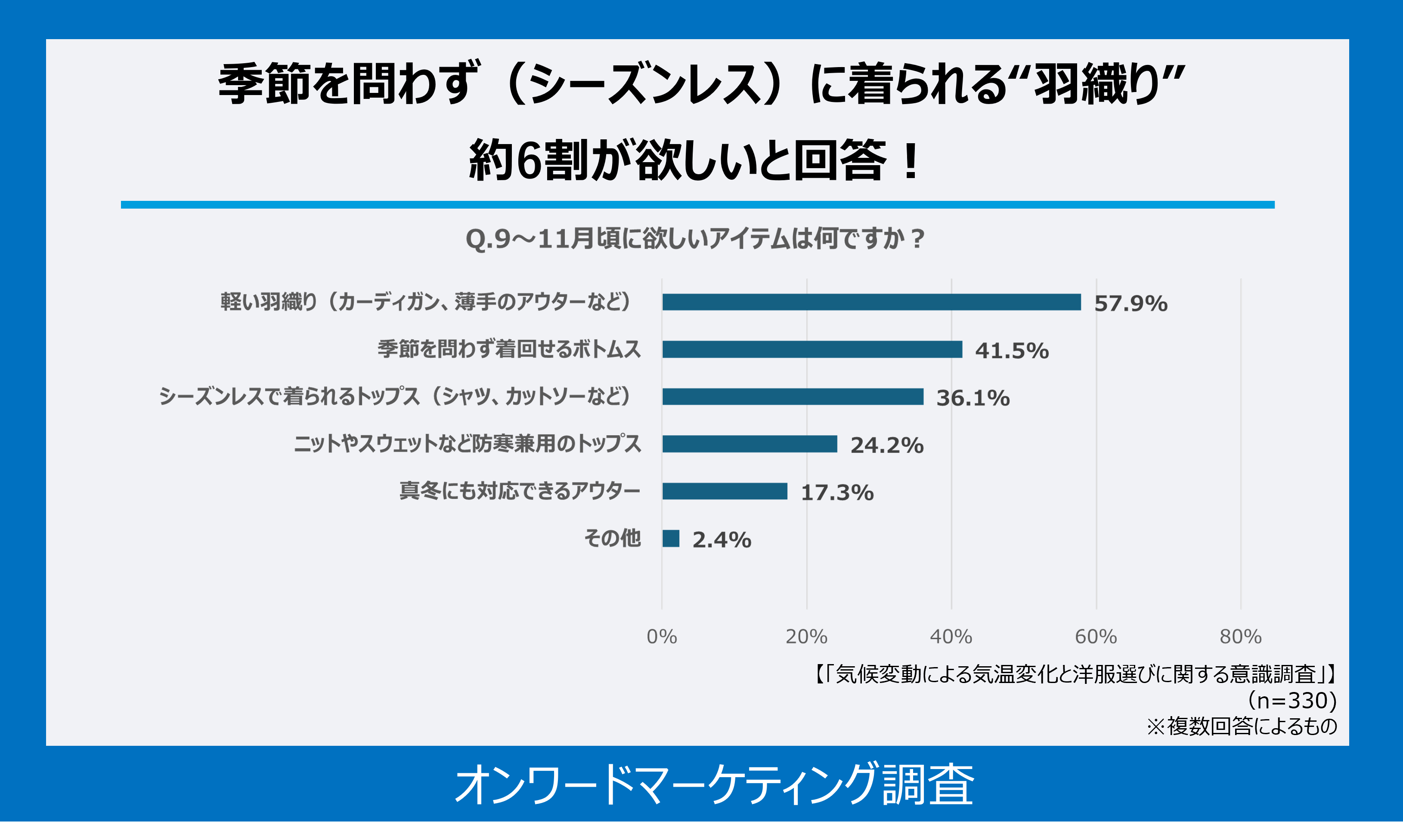 「9〜11月に欲しいアイテムは何ですか?」という設問に対し、「軽い羽織り(カーディガン、薄手のアウターなど)」と回答した人が57.9%で最多となりました。