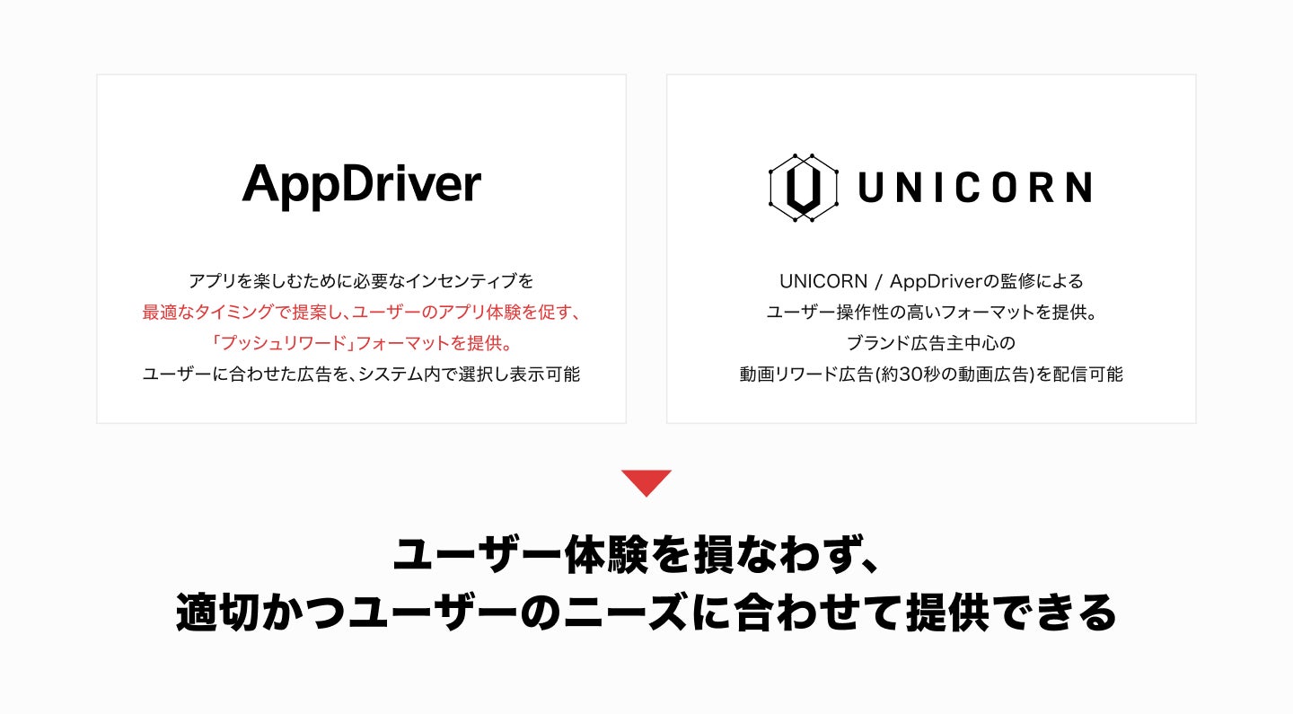 AppDriverは、今回のUNICORNとの連携により、プッシュリワードフォーマットに、ブランド広告主をはじめとした多数の広告主が提供する動画リワード広告を配信できるようになりました。これにより、提携メディアやアプリ事業者は、これまで以上にユーザーに対して効果的かつニーズに合った広告配信を行うことが可能となります。