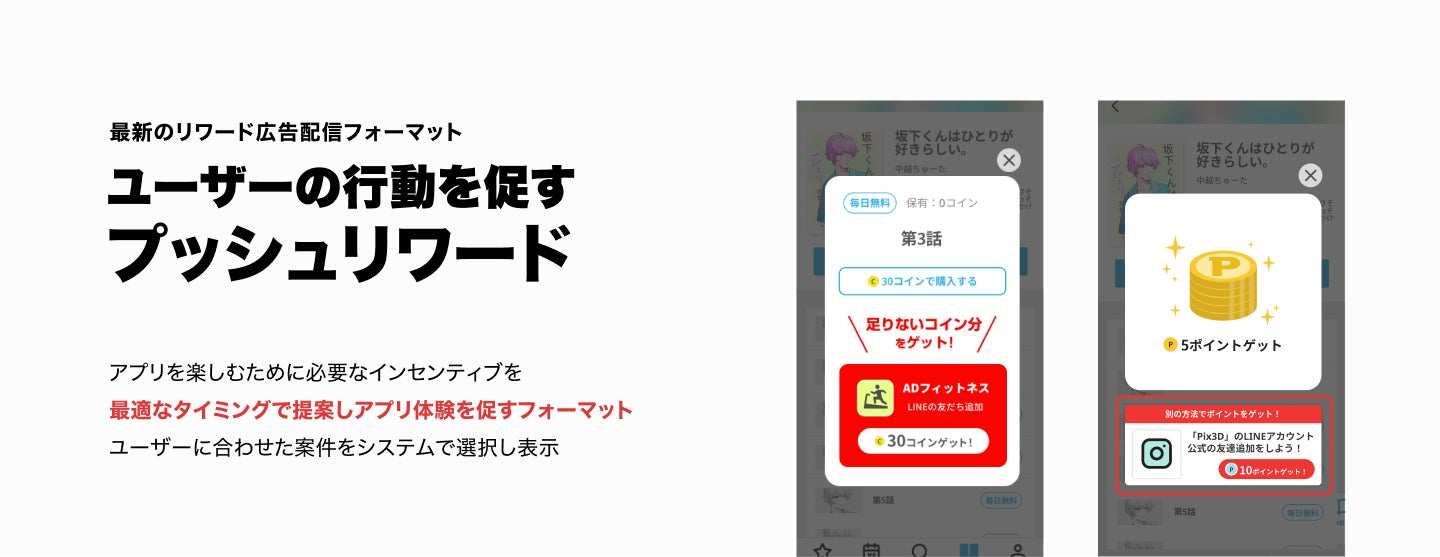 AppDriverは、スマートフォンアプリやWebサイト上に、リワード広告を提供することができる広告配信プラットフォームです。現在は「オファーウォール」と先日新しくリリースを行った「プッシュリワード(※)」の2つのフォーマットをサポートしています。ユーザー体験を妨げることなく、報酬を通じてサービス利用を促進するリワード広告の仕組みは、ユーザー満足度を高め、かつ広告主にとっても効果的な手法であるとして、従来より活用され続けています。