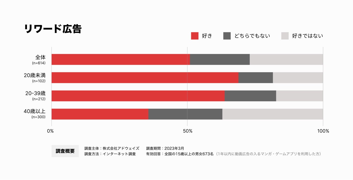 ブランド広告主を中心とした動画リワード広告の提供も行っており、広告主、ユーザーの双方のニーズに合わせた広告運用を実現しています。なお、アドウェイズ独自の調査によれば、ユーザーの約半数以上が、動画リワード広告に対し、好意的な反応を示していることがわかっています。
