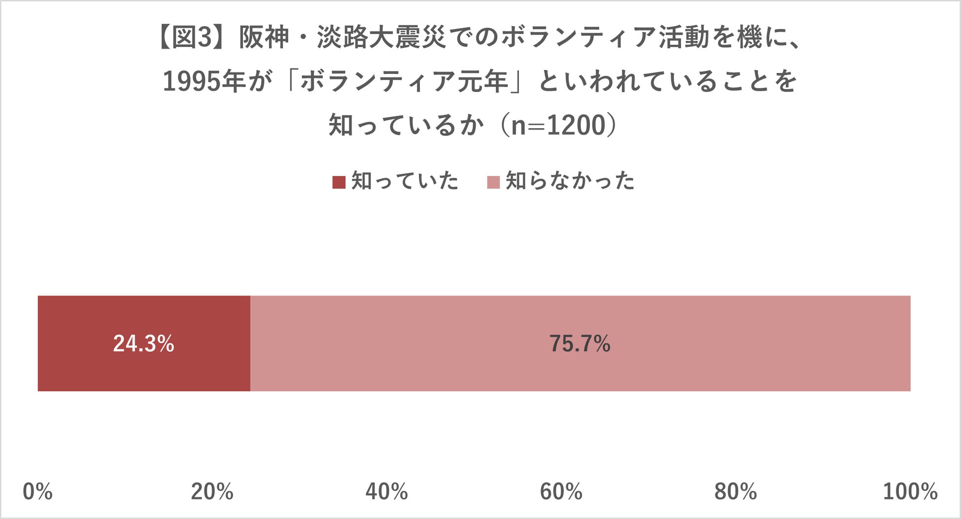 阪神・淡路大震災でのボランティア活動を機に、1995年が「ボランティア元年」といわれていることの認知を尋ねると、回答者全体の75.7%(908人)が「知らなかった」と答えた。この点については、全世代を通して知らない傾向にあった【図3】