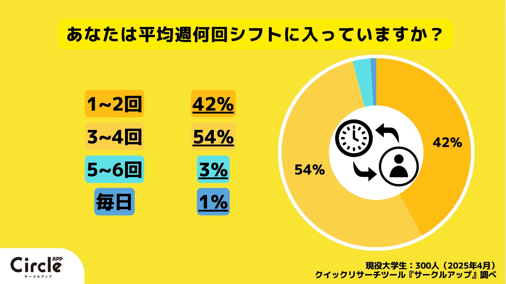 ■アルバイトをしている現役大学生の54%が週平均「3~4回」シフトに入っていると回答。