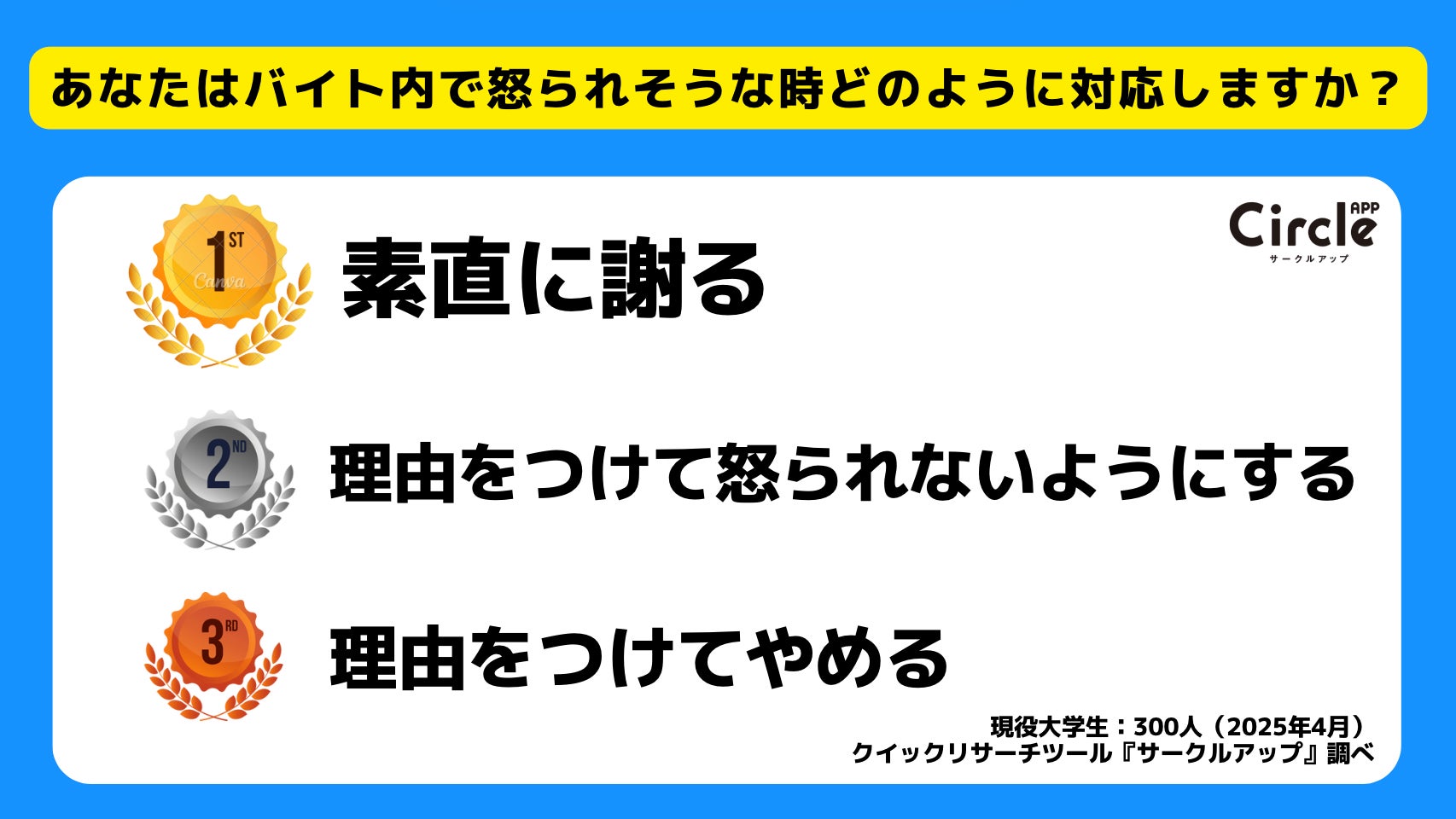 最後に、「バイト内で怒られそうな時どのように対応をするか」質問したところ、アルバイトをしている現役大学生の83%が「素直に謝る」、11%が「理由をつけて怒られないようにする」、2%が「理由をつけて辞める」と回答 (1%以下の選択肢は省略) しました。アルバイトをしている大学生の過半数が素直に謝るようですが、10%以上が「怒られないように立ち回る」事がわかりました。