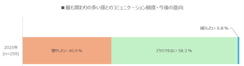 今後の孫とのコミュニケーション意向については「どちらでもない」が58.3%と最も多く、「増やしたい」は40.9%だった。