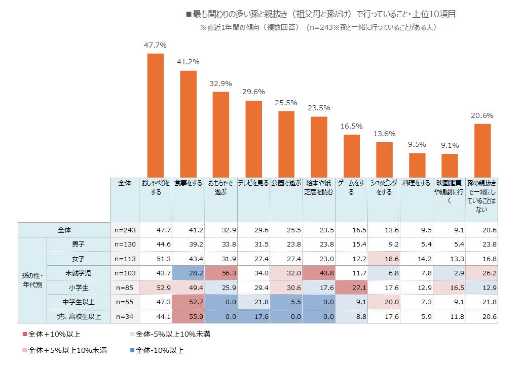 具体的には、直接会う頻度は前回とほぼ同じですが、電話やLINE、メール、オンライン通話などを介したコミュニケーション頻度が減少しています。直接会う孫とは、「おしゃべり」「食事」「テレビ鑑賞」「公園で遊ぶ」「おもちゃで遊ぶ」「絵本や紙芝居を読む」などを親抜きで行っており、これらは以前は親子間で行われた内容です。女の孫とは「ショッピング」も楽しんでおり、“子(孫の親)抜き時間”が充実している様子がうかがえます。