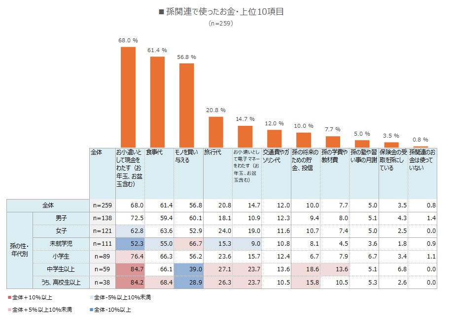 「孫の将来のための貯金、投信」「孫の学費や教材費」は孫が中学生以上の層で高くなっている。