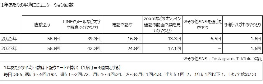 前回と比較すると「直接会う」以外のコミュニケーション方法は、「1年間にコミュニケーションがあった割合」「頻度」ともに減少傾向だった。