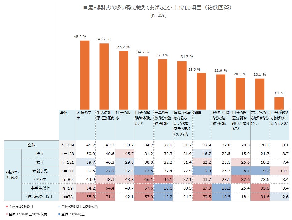 「孫に教えてあげること」の上位は「礼儀やマナー」「生活の知恵・豆知識」 「社会のルール」「自分の経験や体験したこと」など。