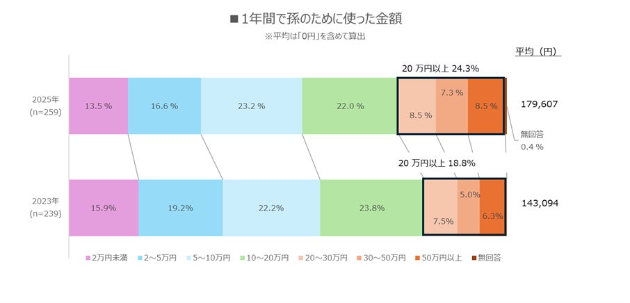 2025年は「20万円以上」の割合が増加し、(2023年:18.8%⇒2025年:24.3%)、平均金額が約3.7万円増加した。