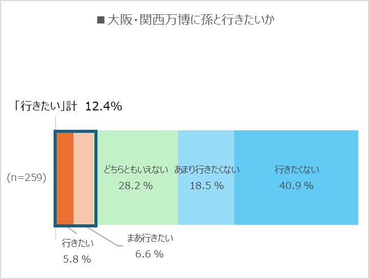 大阪・関西万博に「孫と行きたい」と回答した割合は12.4%だった。 「そもそも自分が興味を感じない」が主な行きたくない理由として挙げられた。