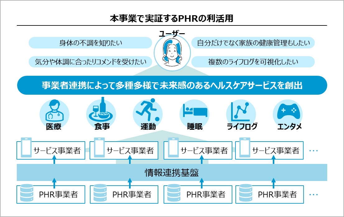 本事業期間には、運動、睡眠、食事等の各テーマにおいて、PHR事業者及びサービス事業者の協調のもと、情報連携基盤を介したPHRを活用したユースケースを提供する仕組みを実証的に実現します。