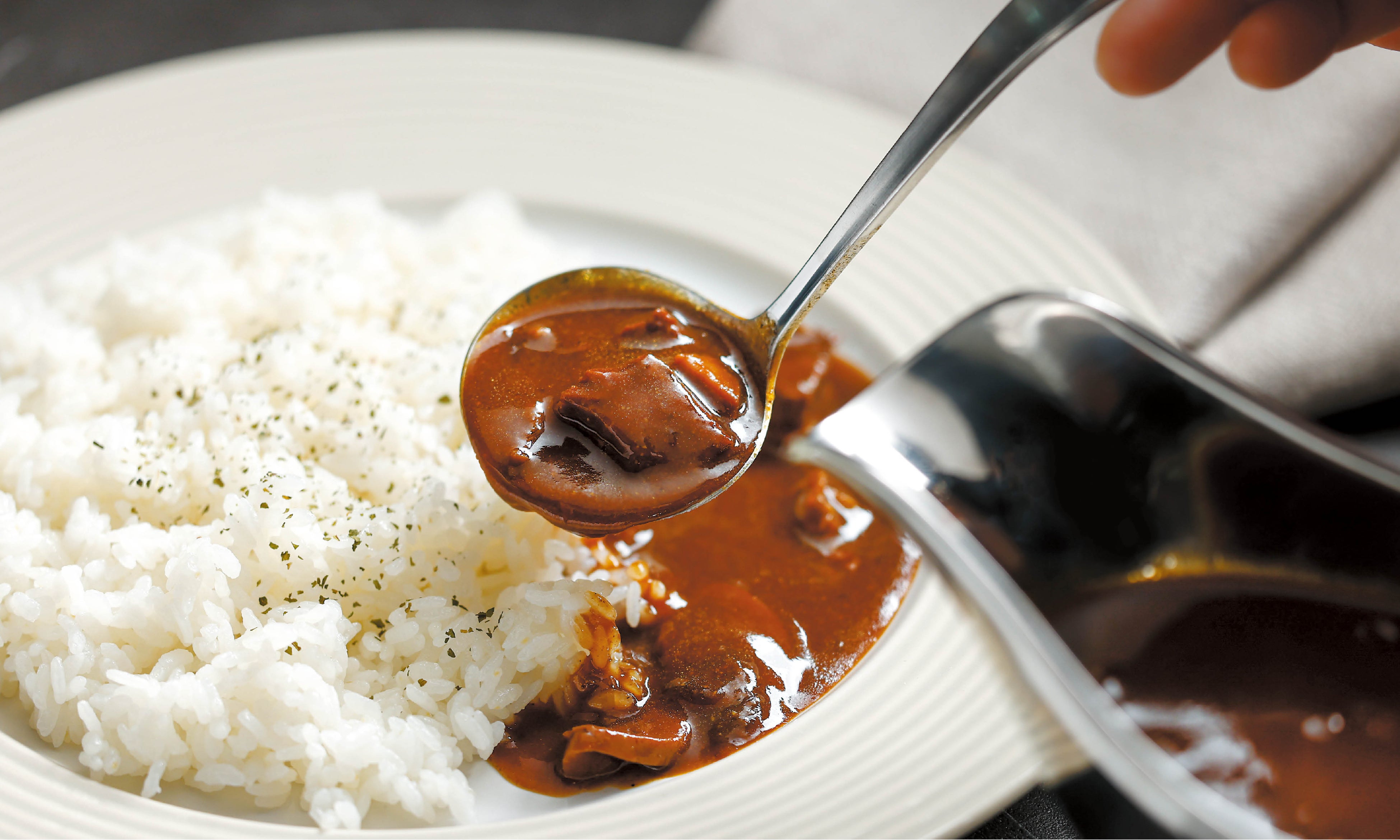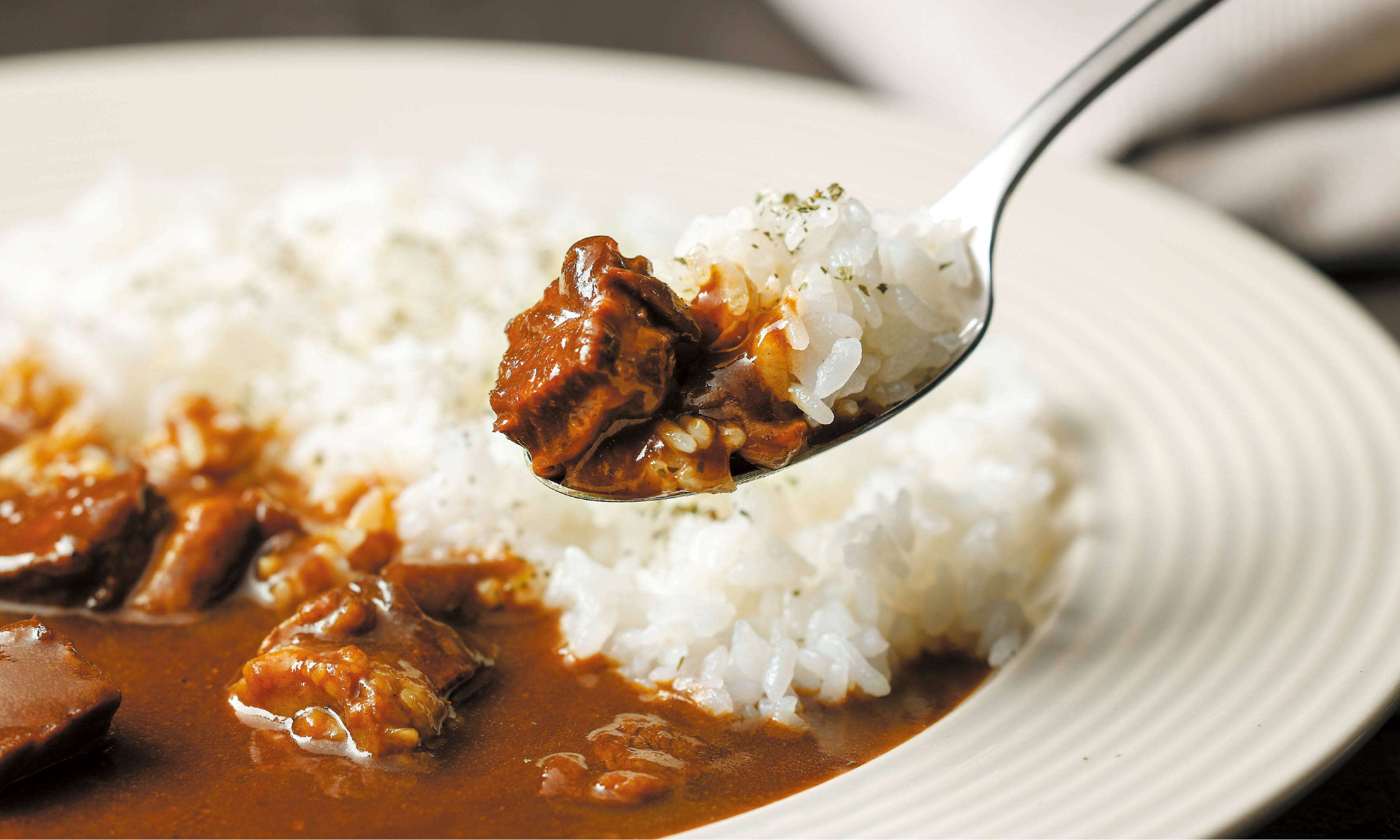 自社オリジナルでスパイスを配合しつつも、牛肉や玉ねぎの旨みと甘み、デミグラスソースにバターを加えてコクをプラス、濃厚なコク深さを際立たせたカレーに仕上げました。さらに赤ワインの酸味を加えることで後味をすっきりとさせ、食べ飽きないおいしさを追求しました。