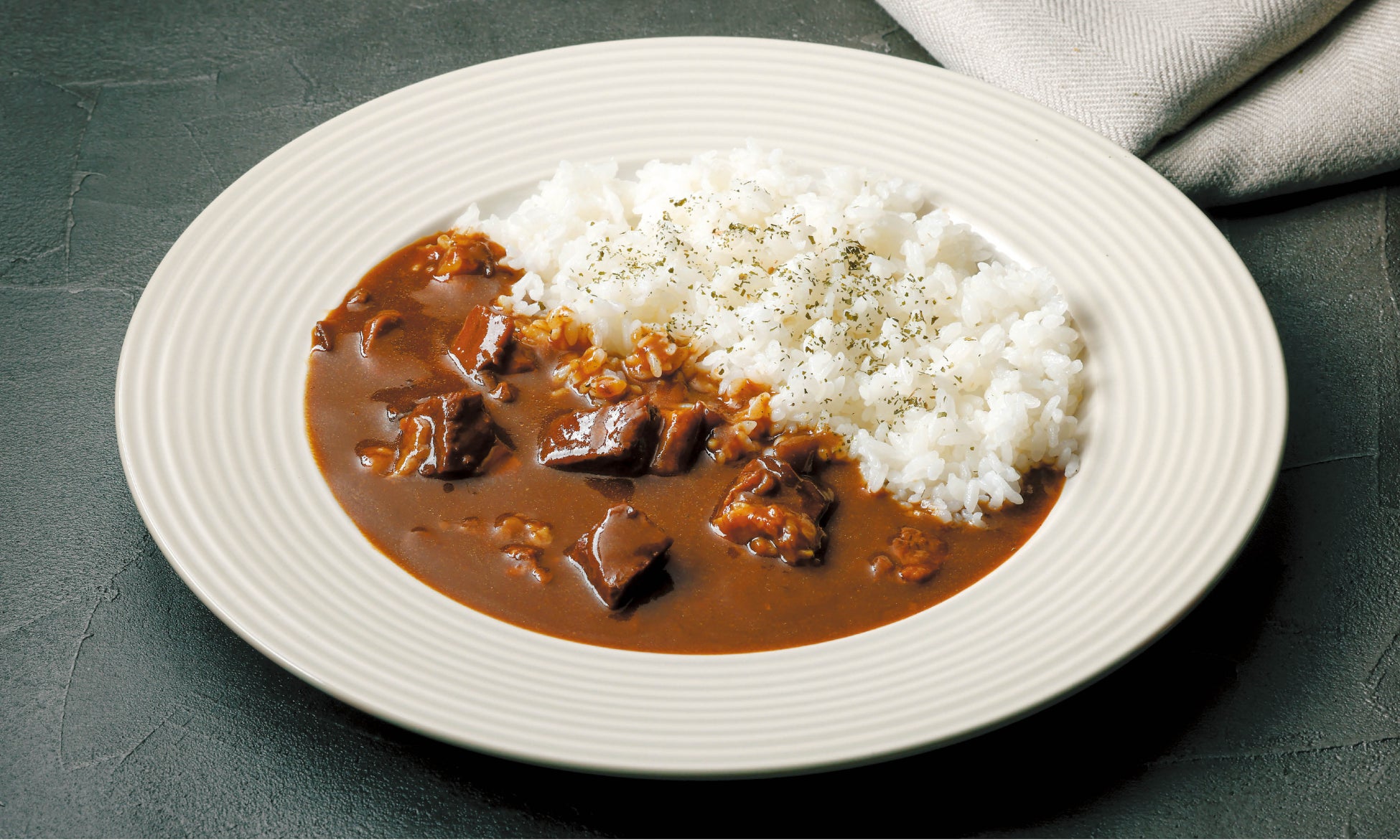 牛肉は牛の旨みと脂の甘みが味わえる濃厚な味わいのバラ肉を使用し、デミグラスソースベースのカレーソースに仕上げました。さらにバターのコクと赤ワインの酸味を加えることで、コクがありつつもマイルドで後味すっきりとした味わいに。まるで圧力鍋で煮込んだかのような、ほろほろとほどける柔らかく大きな牛肉が入っており、食べ応え抜群!欧風カレーのもつコクと旨みだけでなく、しっかりスパイスの風味も感じられる上品な味わいに仕上げております。