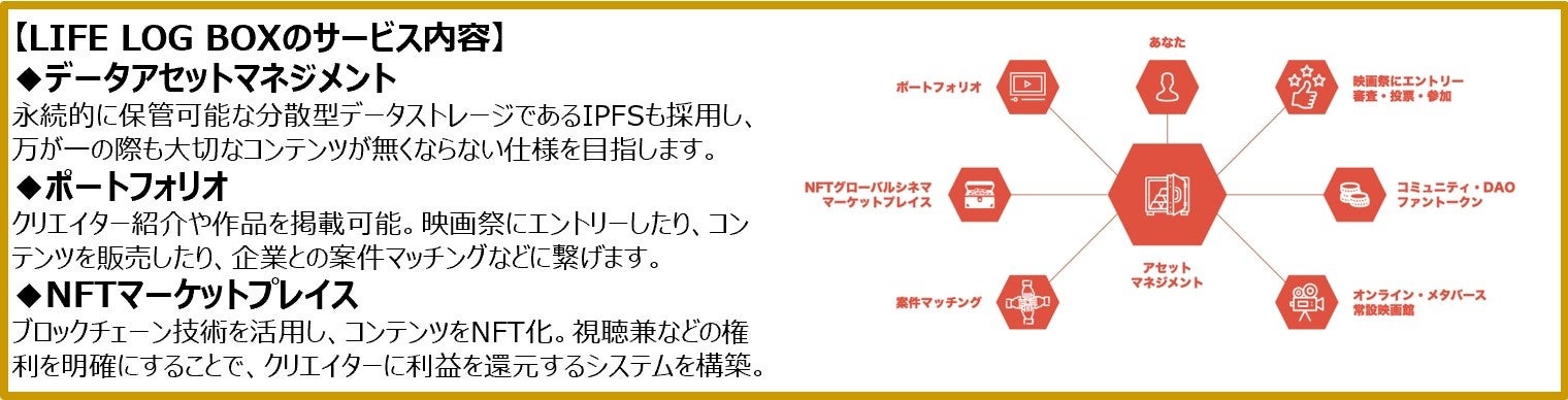 スマートフォンやSNS、動画配信サービスなどの充実により、誰もが一クリエイターとしてコンテンツを創作し発信できるWEB3.0時代、永続的に保管可能な分散型データストレージで、万が一の際も大切なコンテンツが無くならない設計のデータアセットマネジメント、世界中のクリエイター&コンテンツ、ビジネスをマッチングさせることが可能なポートフォリオ、所有権などの権利を明確にしクリエイターに利益を還元するNFTマーケットプレイスの3つのサービスを軸に展開いたします。