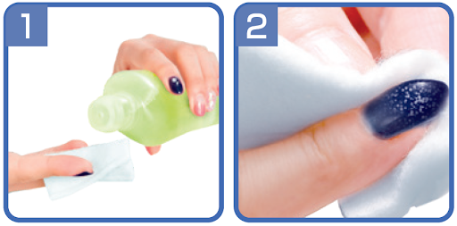 ①コットンに適量を含ませ、爪を軽く押さえるようにして拭き取ります。