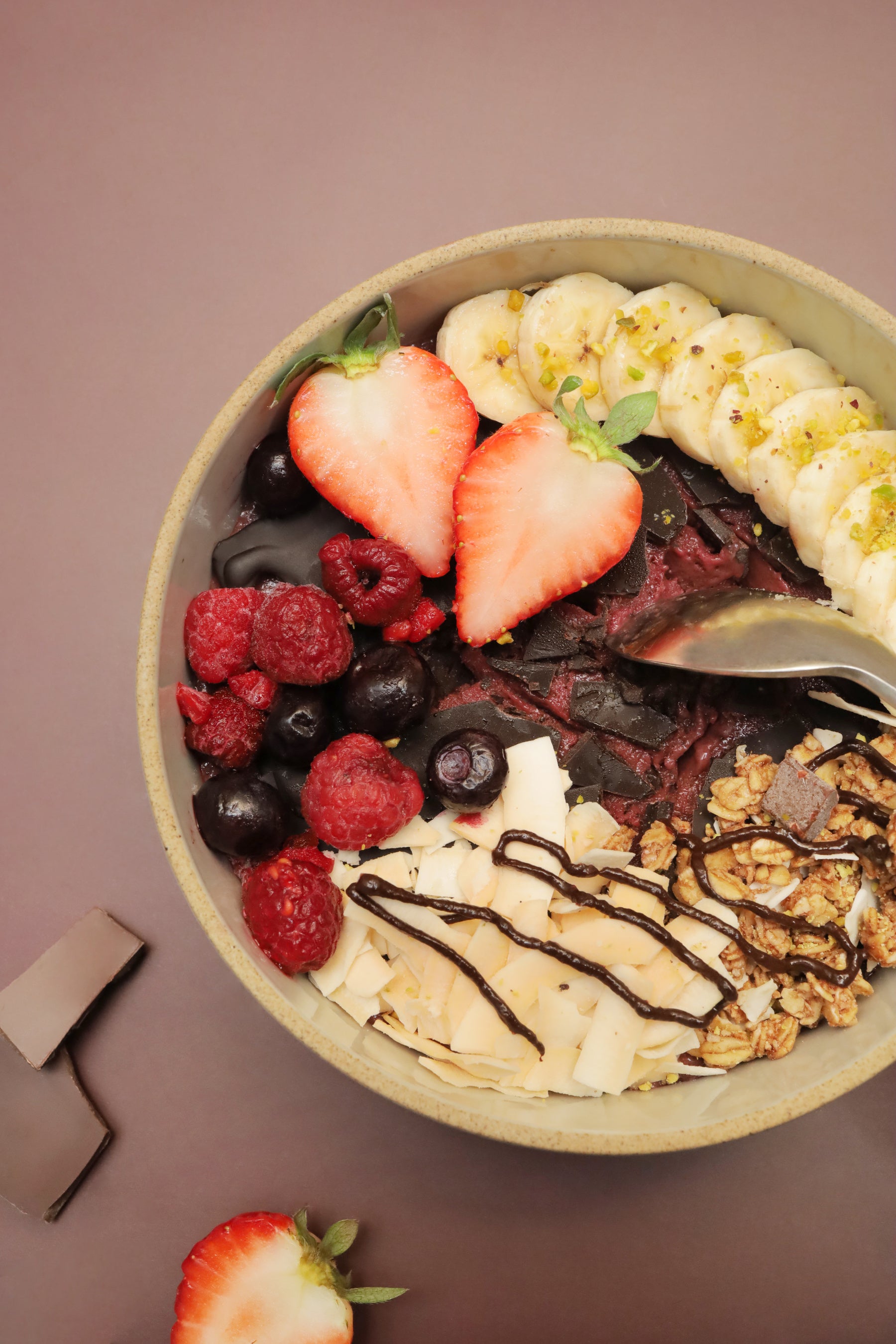 チョコレートを“割って”食べる、新感覚のアサイーボウル。もったりしたアサイーベースの上に、チョコレートをコーティング。スプーンで軽く叩いて割り、食べるとパリパリと心地よい音と食感が楽しめるのがオススメポイントです。THE_B自家製のチョコレートはココナッツオイルベースでシンプルな材料のみを使用した乳製品不使用のプラントベース仕様。また、ブルーベリーやラズベリー、バナナなどのフルーツをふんだんに使用し、美味しさだけでなく、むくみやくすみ対策など美容面も意識した一杯です。