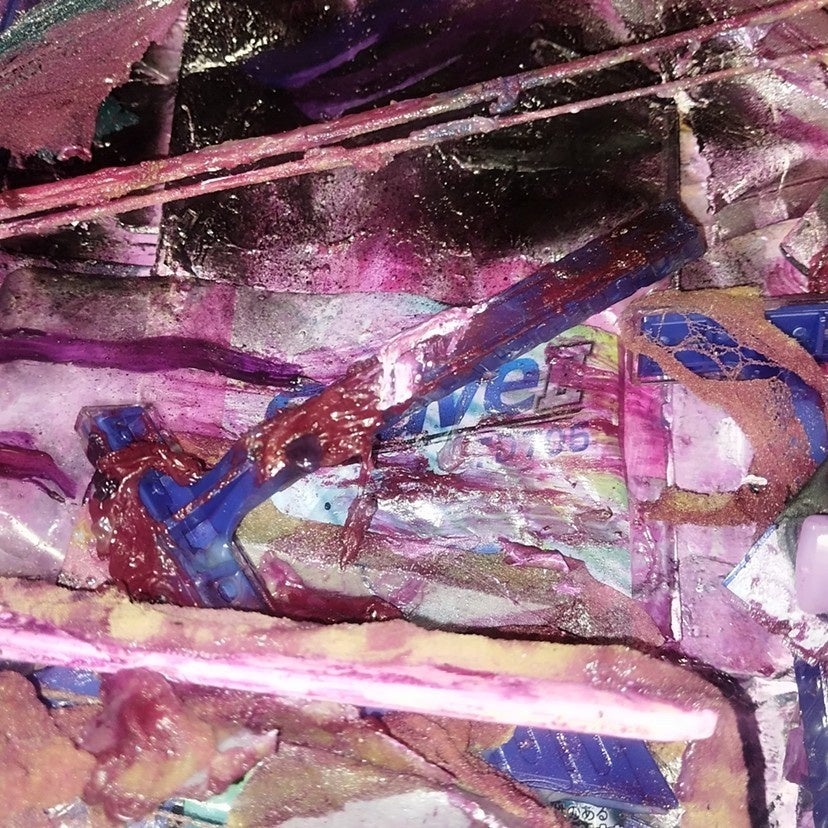 今実佐子は、化粧品を画材として用い、自画像と称する抽象絵画を制作しています。支持体の研究を重ね、自身をキャンバスに見立てて装飾していく様は、さながら生の痕跡を刻むための儀式のようです。