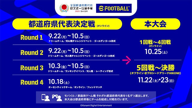 9月22日(月)に開幕する「eFootball™」では、誰もが幅広くエントリーできるよう、昨年に引き続き、モバイルと家庭用ゲーム機にて都道府県代表を選出します。本日からWEBページを公開し、11月の決勝大会までの概要などを紹介していますので、ぜひご確認ください。