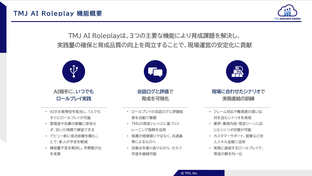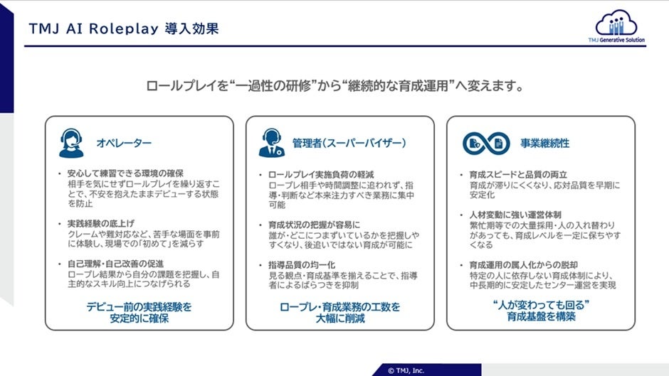 加えて、オペレーター育成では、実践的なロールプレイの量と質を確保しながらSV(スーパーバイザー、管理者)の負荷を抑えたいという要望が根強くあります。従来型の対面指導や教材では練習量に限界があるなか、生成AIの進化により、顧客役として自然な対話を再現し、リアルタイム応答・客観評価・シナリオ自動生成を一体的に行うことが可能となりました。心理的負担を抑えつつ練習量を増やし、データに基づく精度の高い指導が実現できるようになったこと、さらに提案活動においてクライアントからの要望が非常に強かったことから、実践型育成を支える新サービス「TMJ AI Roleplay」を提供します。
