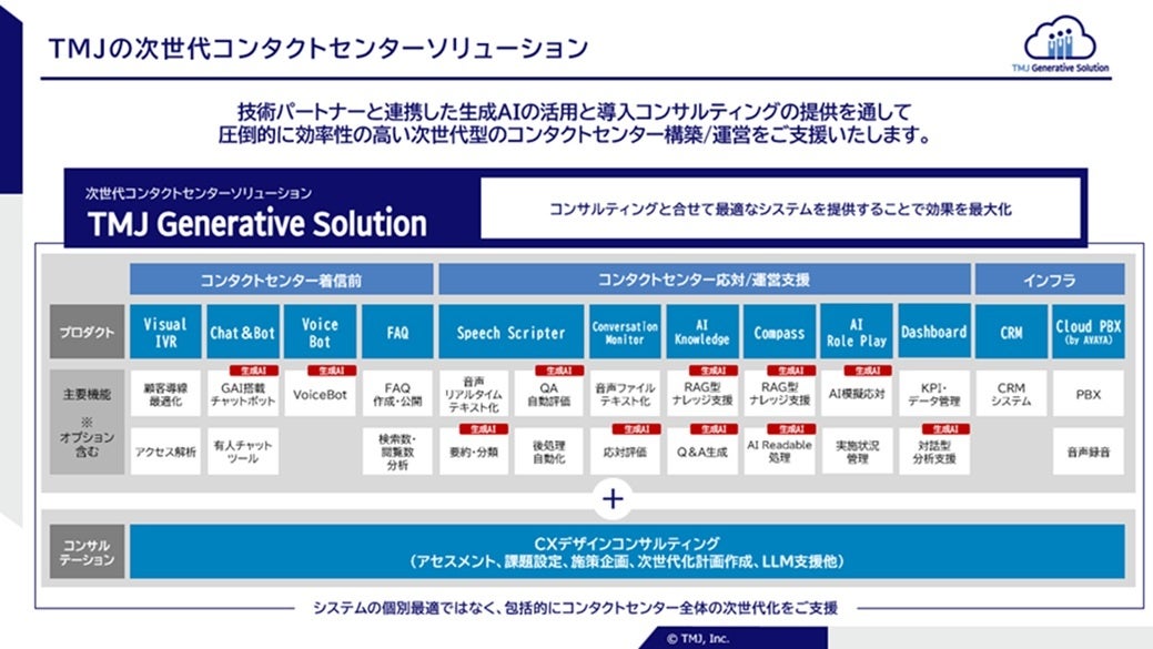 コンタクトセンター・バックオフィス(事務処理センター)の構築・運営を行うセコムグループの株式会社TMJ(本社:東京都新宿区、代表取締役社長:丸山 英毅、以下TMJ)は、生成AIを活用した業務変革支援サービス「TMJ Generative Solution」シリーズに、高度なナレッジツール「TMJ Compass」とAIロールプレイトレーニングツール「TMJ AI Roleplay」の2サービスを新たに追加し、2026年4月14日より提供を開始します。