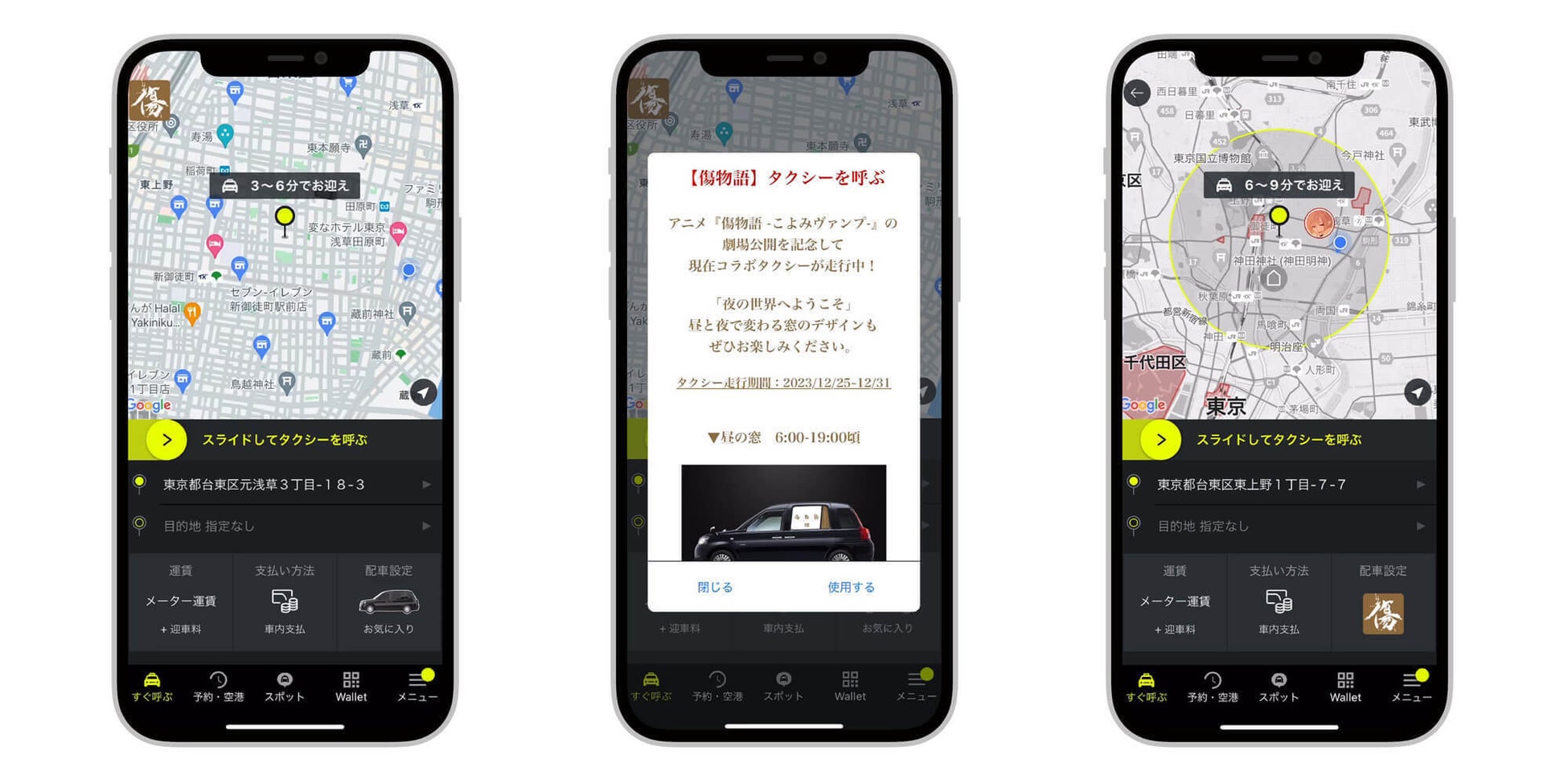 タクシーアプリ「S.RIDE」を起動し、画面左上に表示されている『傷物語-こよみヴァンプ-』のアイコンをタップし、「使用する」を選択することで配車可能。