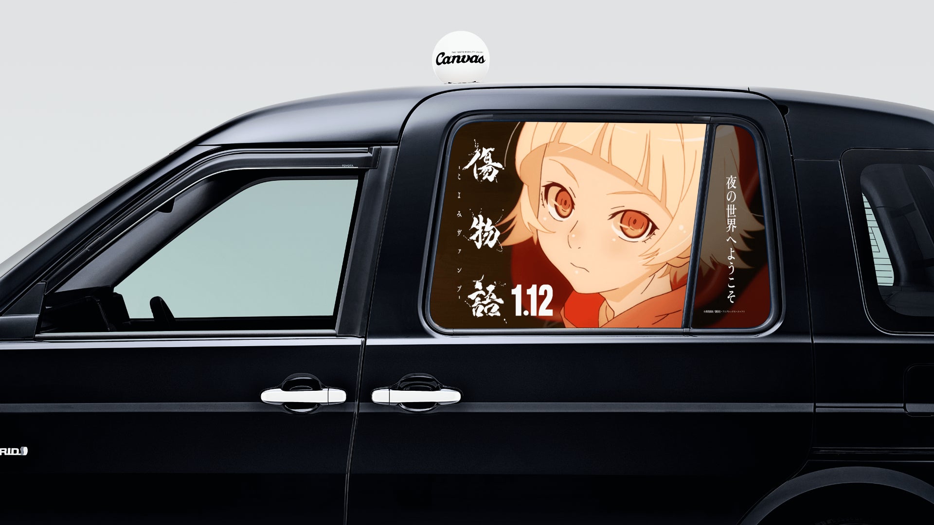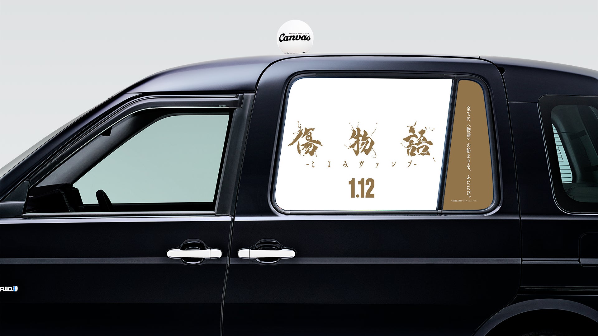 モビリティプラットフォーム事業を展開する株式会社ニューステクノロジーとタクシーアプリ 「S.RIDE(エスライド)」を提供するS.RIDE株式会社は、両社が運営するモビリティ車窓メディア「THE TOKYO MOBILITY GALLERY Canvas」(以下「Canvas(キャンバス)」)において、『傷物語 -こよみヴァンプ-』の1月12日(金)の全国劇場公開決定を記念した「傷物語タクシー」が2023年12月25日(月)より期間限定で都内を走行することをお知らせします。タクシーアプリ「S.RIDE」から、昼と夜で窓ガラスのデザインが変わる「傷物語タクシー」を指定して配車可能です。