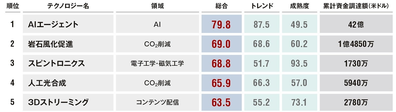 技術の成長期待値をスタートアップの資金調達動向を基に算出。「AIエージェント」「岩石風化促進」「スピントロニクス」が上位