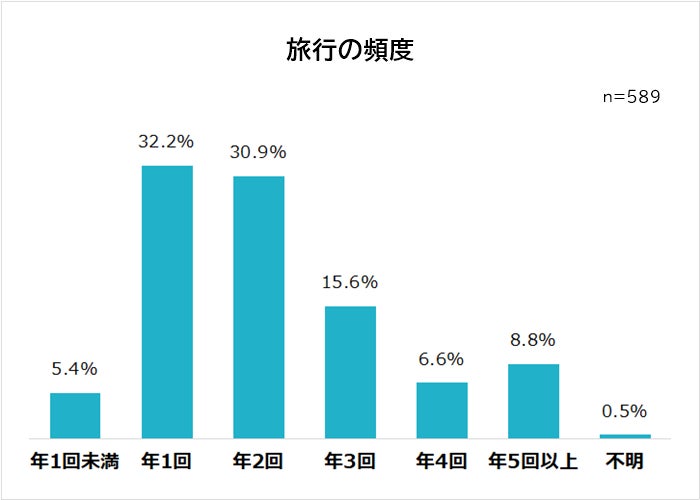 全国の男女589人に「旅行の頻度」を聞いたところ、多かったのは「年1回」「年2回」という回答で、平均は年2.4回でした。