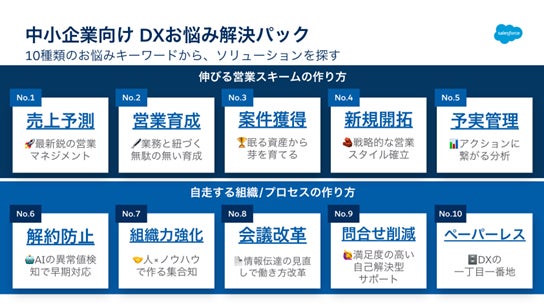 Salesforceでは、これまで日本全国の多くの中小企業のDX推進を支援していますが、直面する多くのビジネス課題には一定レベルの共通項があることが判明しました。その課題には、これからDXに本格的に取り組む上で、自社の課題を正確に把握することの難しさや、何から着手をすべきかの優先順位付けができないことが挙げられます。 このような課題を解決に向け、企業の本質的な課題へアプローチするための「Salesforce 中小企業向け DXお悩み解決パック」を通じて、個々の企業に寄り添った支援を提供していきます。企業は、日常業務のなかで直面する課題と照らし合わせながら、10種類のキーワードの中から自社の抱える悩みに近いものを選択するだけで、具体的な解決策や解決後の業務イメージを解像度高く持つことができるようになり、自社での適用に向けて一歩目を踏み出すことができます。また、すでに積極的にテクノロジーを活用した業務改革に取り組んでいる顧客においても、さらなる成長を目指す上で必要となる競合との差別化やDXを活用した顧客接点改革に向けたノウハウの習得により、成果を上げる強い組織づくりに効率良く取り組むことができます。