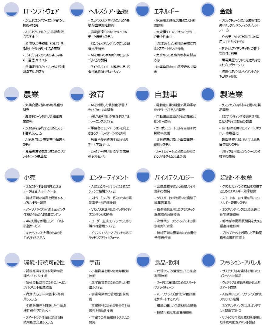 現代の技術革新は、社会のさまざまな分野で前例のないスピードで進行しています。このダイナミックな変化に対応するため、企業や研究機関は、従来の枠組みを超えたオープンイノベーションの取り組みにより、新たなアイデアやソリューションを模索しています。以下では、ITから環境、ファッションに至るまで、幅広い分野で募集されることがある、先進的で革新的な課題の例を紹介します。