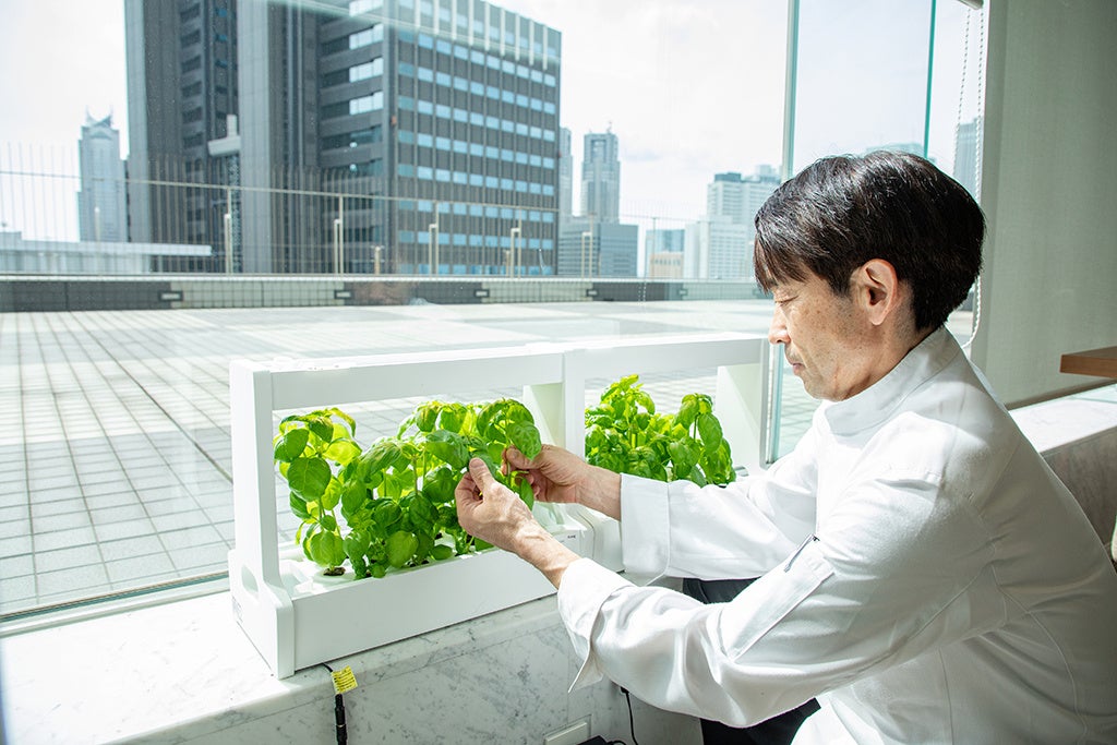 コースで提供する「バジルブレッド」は、当ホテル内にあるスペースにて水耕栽培で育てたスイートバジルで焼き上げた、料理長おすすめのパンです。