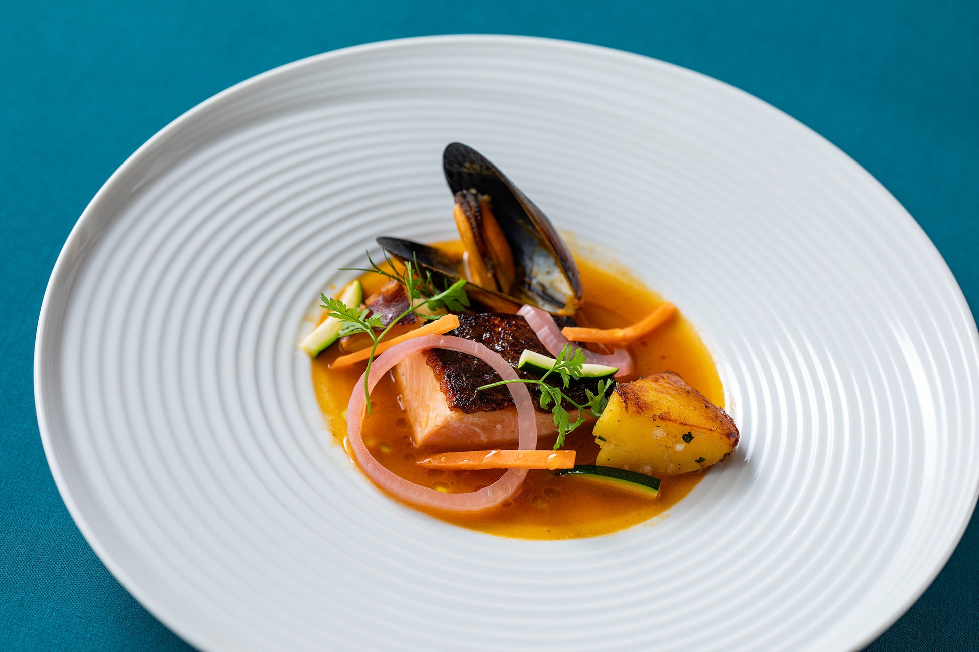 またこの濃厚スープは、ディナーコースの魚料理「銀鮭と魚介のナージュ」のソースでも登場。宮城県で初めて養殖に成功し、養殖の水揚げ量日本一の女川町が誇る銀鮭やムール貝などの魚介とともにお楽しみいただきます。