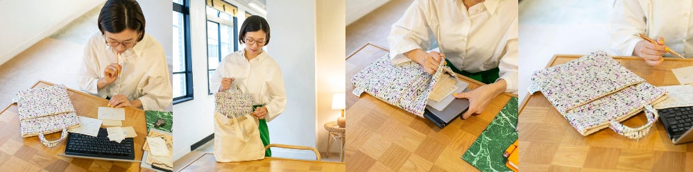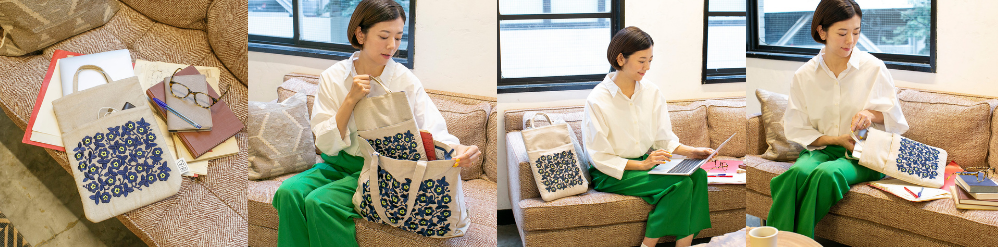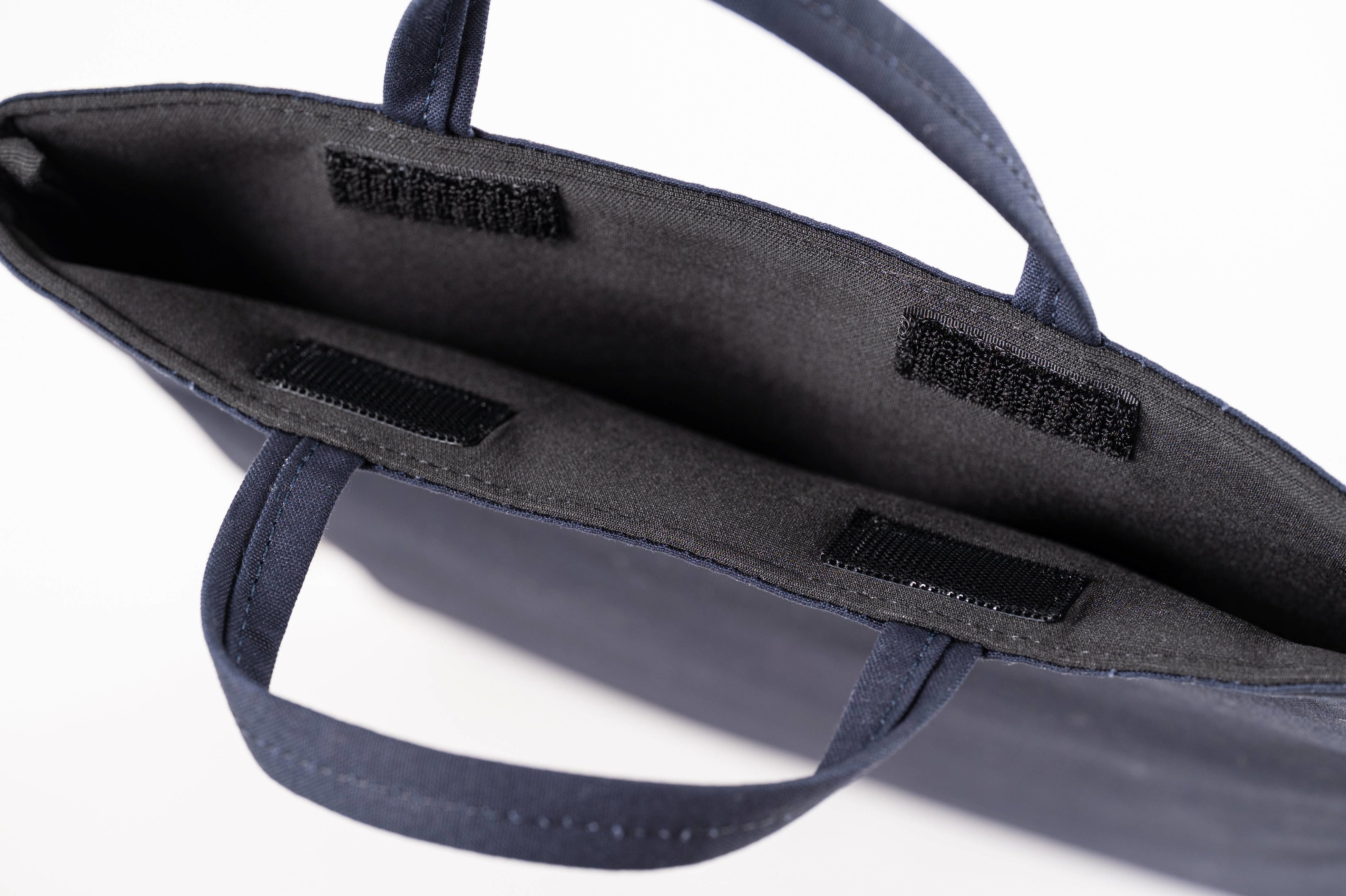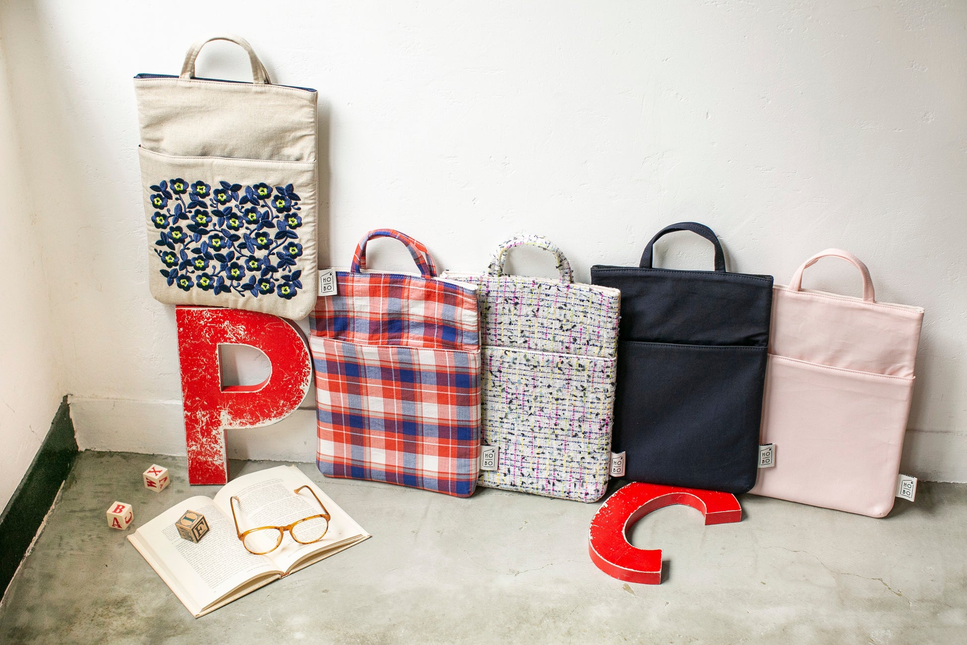 「いつでもトート・パニーニ」は、薄型・軽量で、13インチのノートパソコンやA4サイズの紙資料が収まるトートバッグです。縦長のフォルムに持ち手がついているのでリュックやバッグの中から出し入れしやすいのが特徴です。布地で中身をやさしくサンドするようなかたちなので「パニーニ」と名付けました。外側には、面ファスナーつきの大きなポケットがあり、充電コードやマウス、イヤホン、手帳などをいれることができます。間口には、2箇所に面ファスナーがついていて、バッグの中身が飛び出すのを防いでくれます。取り出すときもワンタッチでさっとひらいて便利です。内布にはふかふかとしたダンボールニット素材を使用しています。空気をためられるような構造の編地で、軽さと扱いやすさがポイントです。シンプルな無地柄からチェックやツイードなど5種類の色柄でご用意しました。