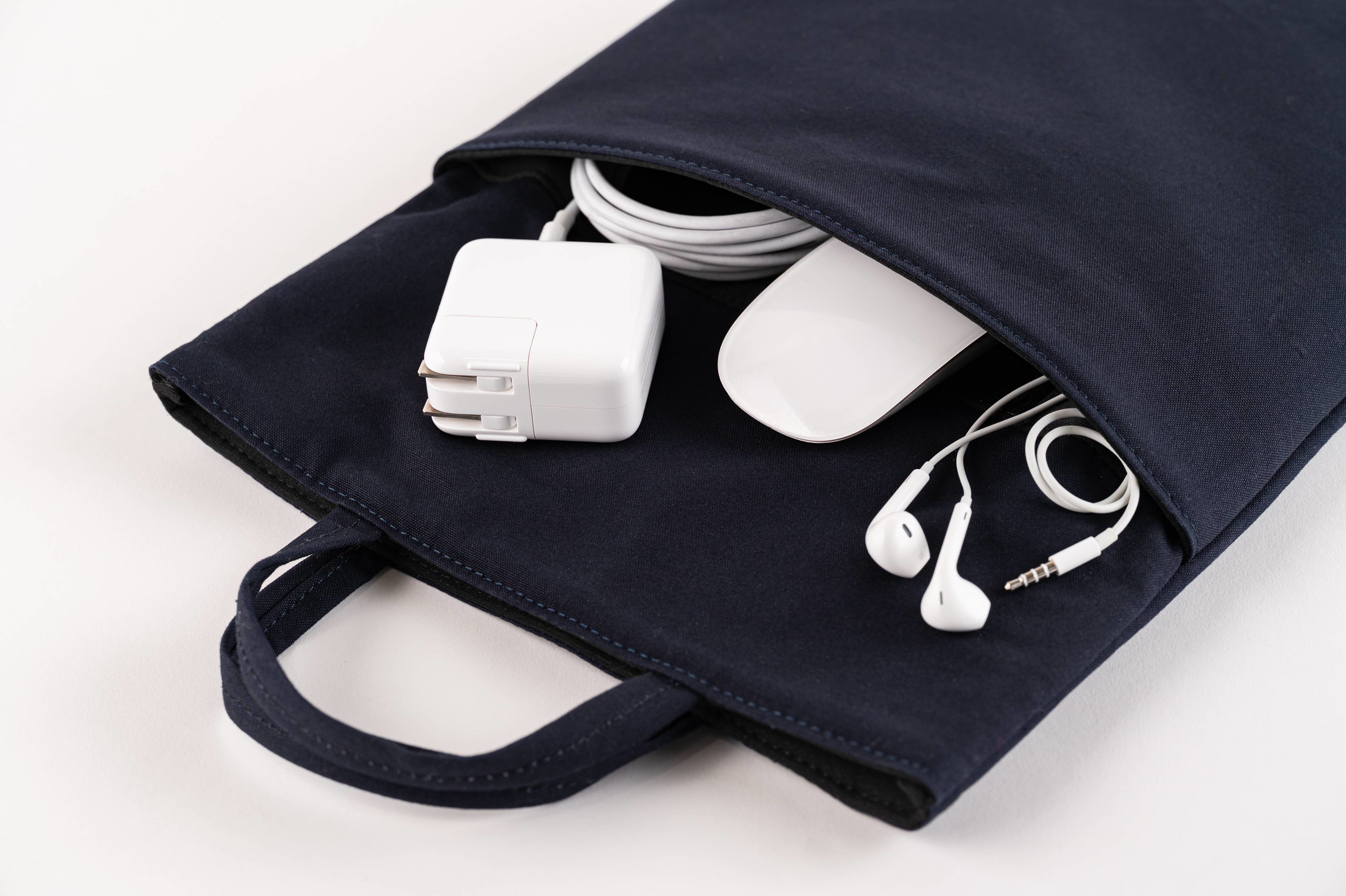 外側には面ファスナー付きの大きなポケットがあり、充電コードやマウス、イヤホン、手帳などを入れることができます。