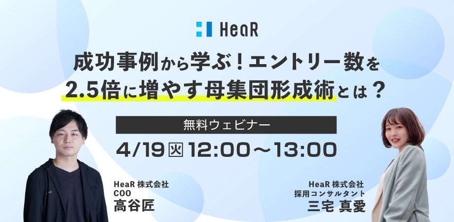 採用支援のHeaR株式会社(本社:東京都品川区、代表取締役CEO:大上諒、以下「HeaR」)は、企業の人事・採用・経営者様向けに、採用力向上に役立つホワイトペーパー「エントリー数を2.5倍に増やす母集団形成術」を公開しました。ホワイトペーパーは無料でご覧いただけます!