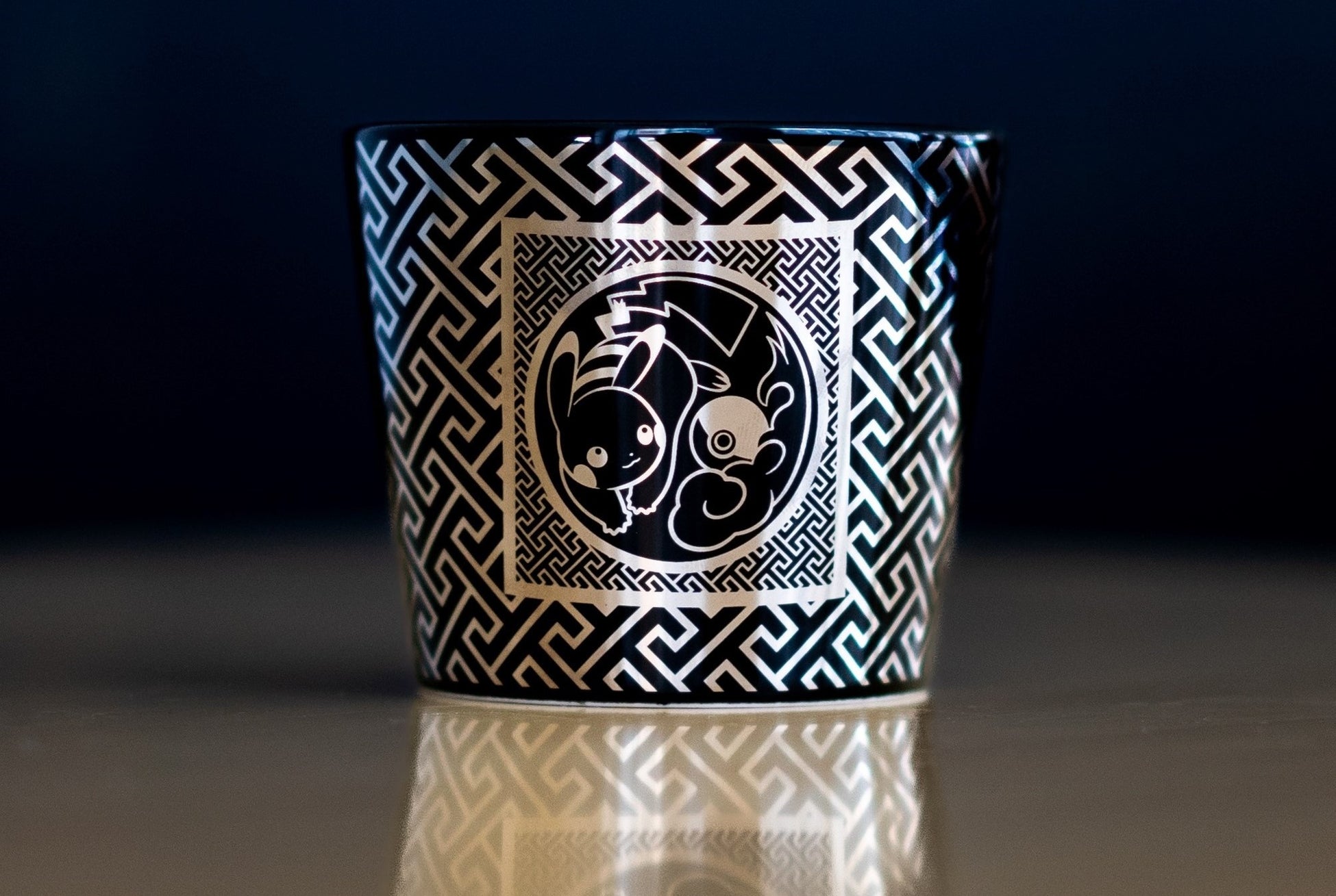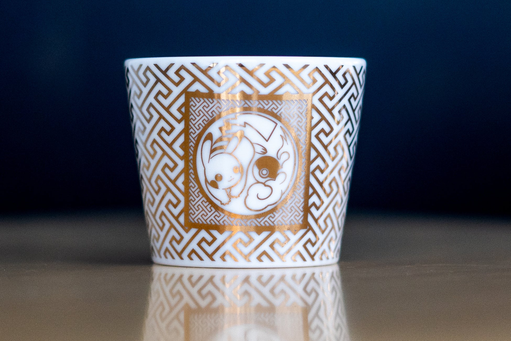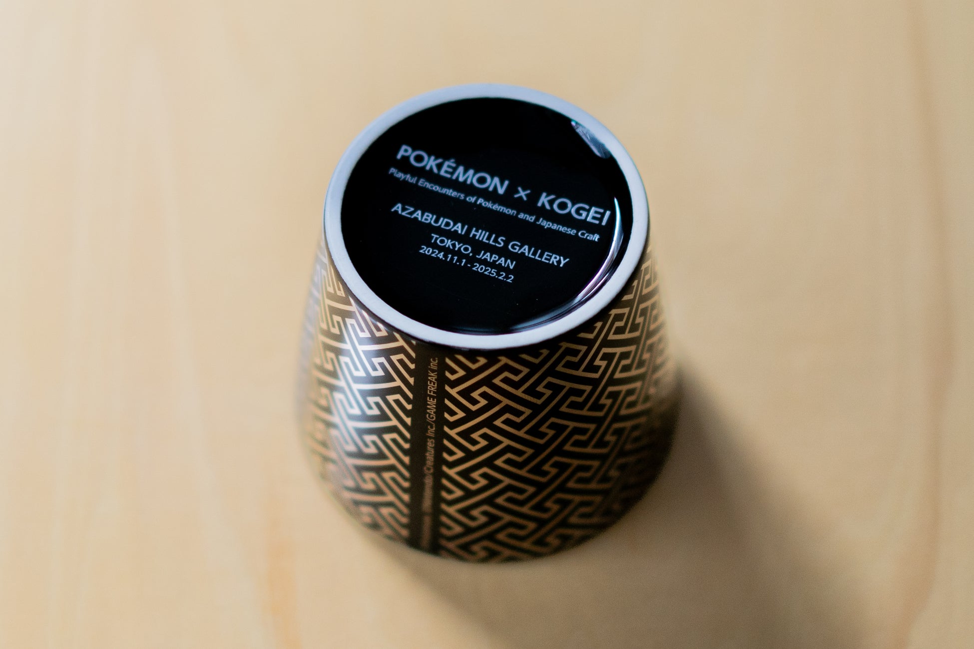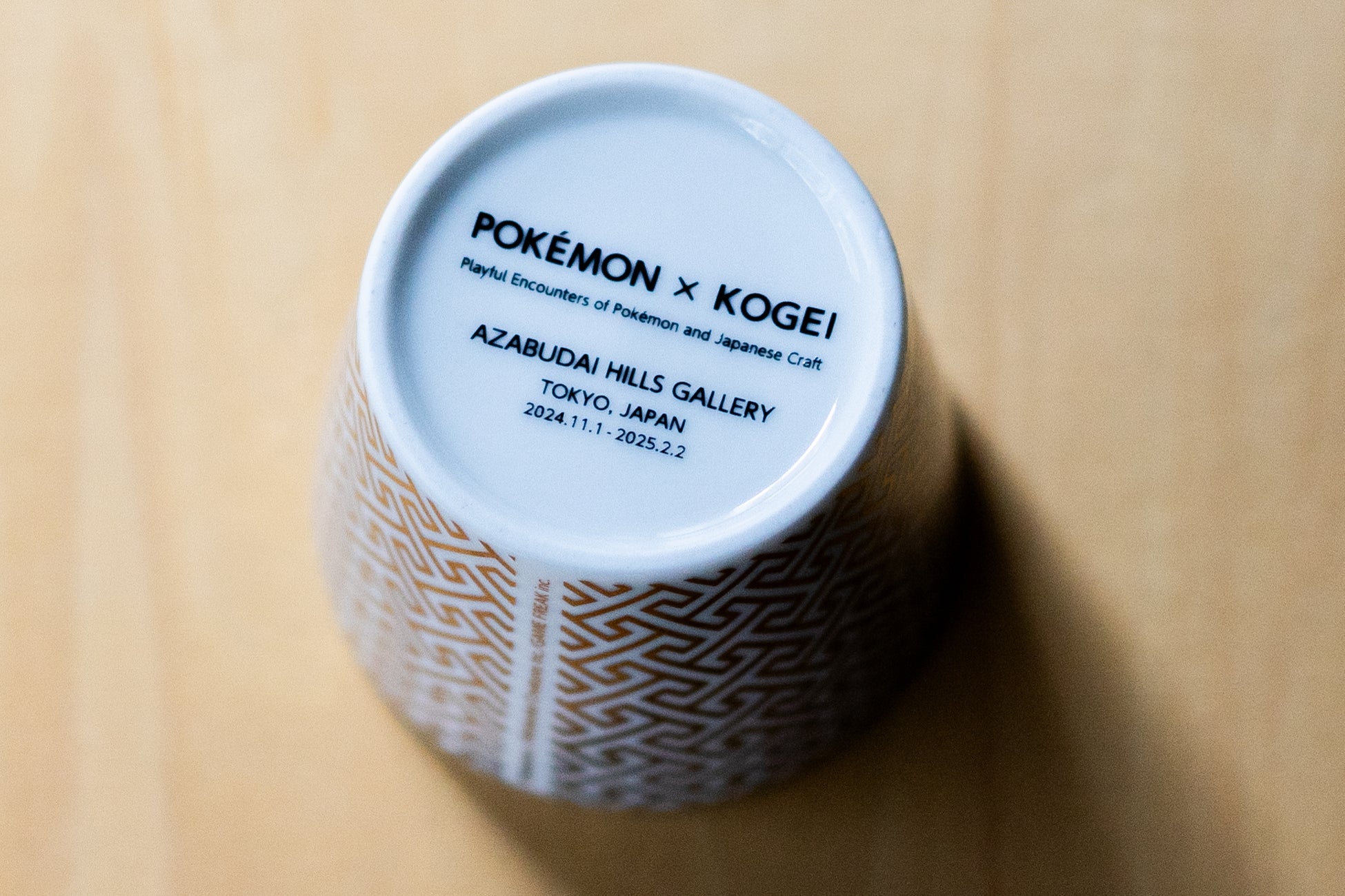きらきらと金色に輝く工字繋ぎの文様と、ポケモン×工芸展のシンボルマークをプリントした磁器製のフリーカップが付いたチケットです。カップの底面にはポケモン×工芸展と麻布台ヒルズ ギャラリーのロゴ入り。展覧会ショップでは手に入らない、本チケット特別仕様のスペシャルグッズです。