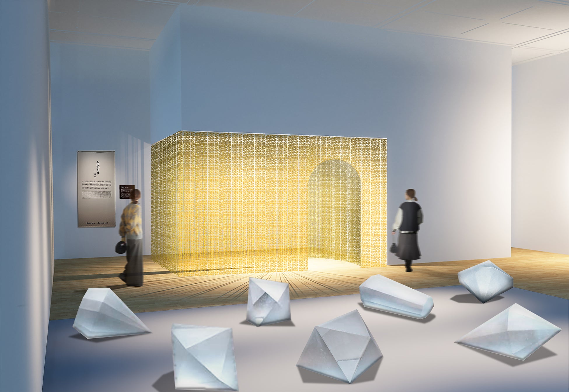 会場内のイメージを具現化したパースを公開いたします。麻布台ヒルズ ギャラリーでは、今までの巡回展からバージョンアップし、数名の作家による追加作品を展示し、展示作品は約 80 点になる予定です。