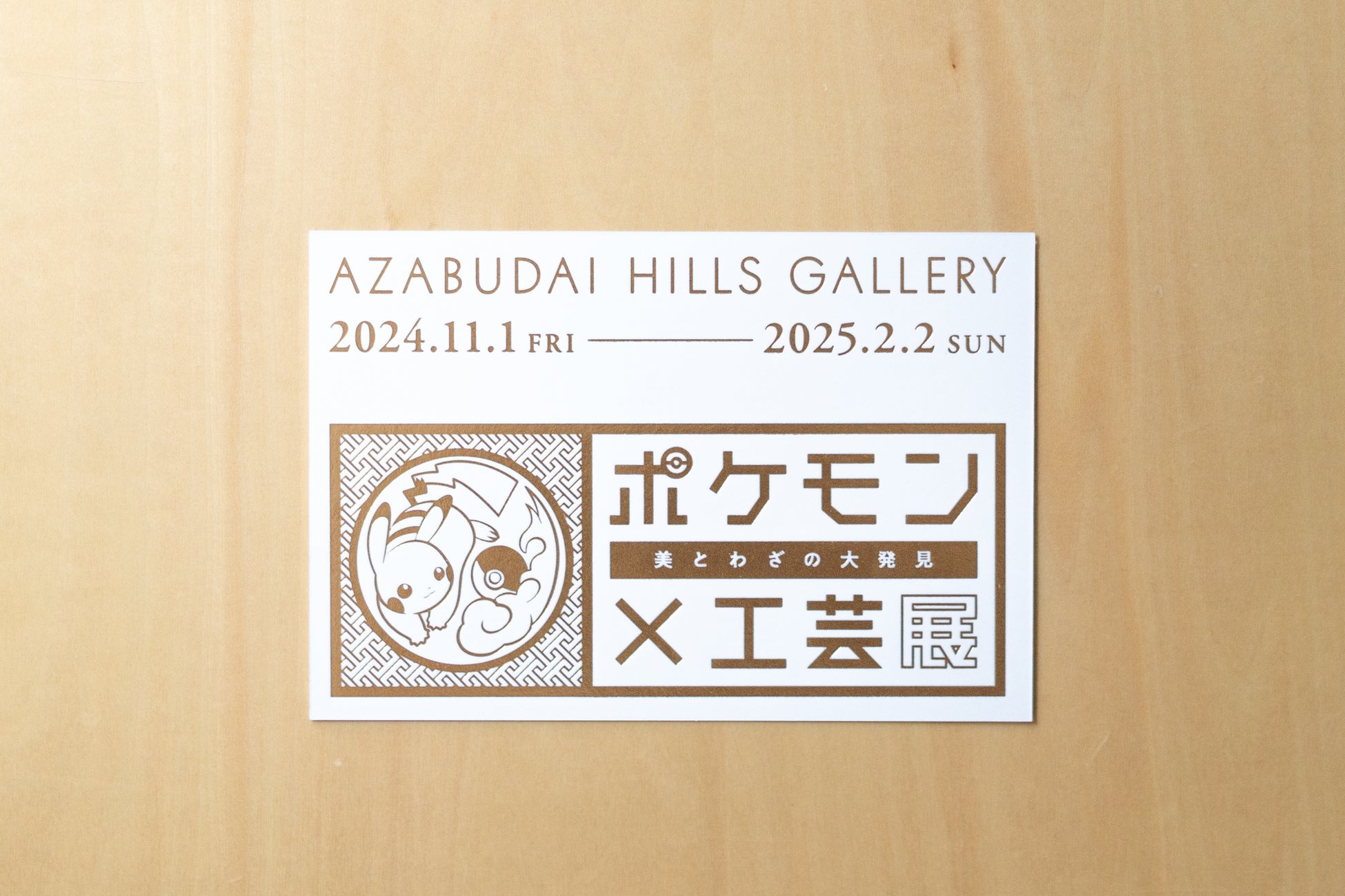ポケモン×工芸展のロゴを、きらきらと光る金色で箔押し加工した、本チケットだけの特製ポストカード付です。ポストカードを動かして角度を変えると、ピカチュウとモンスターボールが黄金に輝きます。