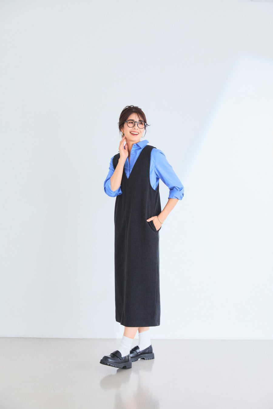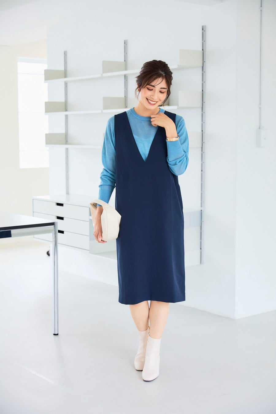 「ブルーのシアーニットとネイビーのジャンパースカートの組み合わせは、シンプルながらも知的で爽やかにまとまります。胸元の深めのVラインが首元をスッキリ見せてくれるので、細見え効果もアップ」