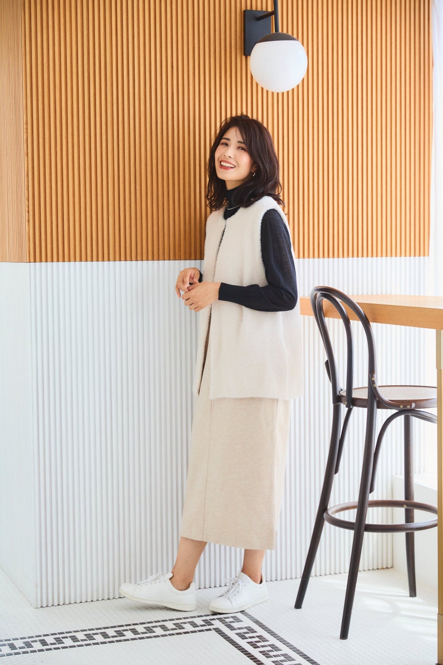 「きちんと見えしてくれるシャツとのレイヤードで、シャープで洗練されたモード感を演出。胸元のVラインがロング丈でも重くならずに抜け感のある印象に。オフィスはもちろん、子どもの学校行事でもさりげなく周りと差がつくコーデです」
