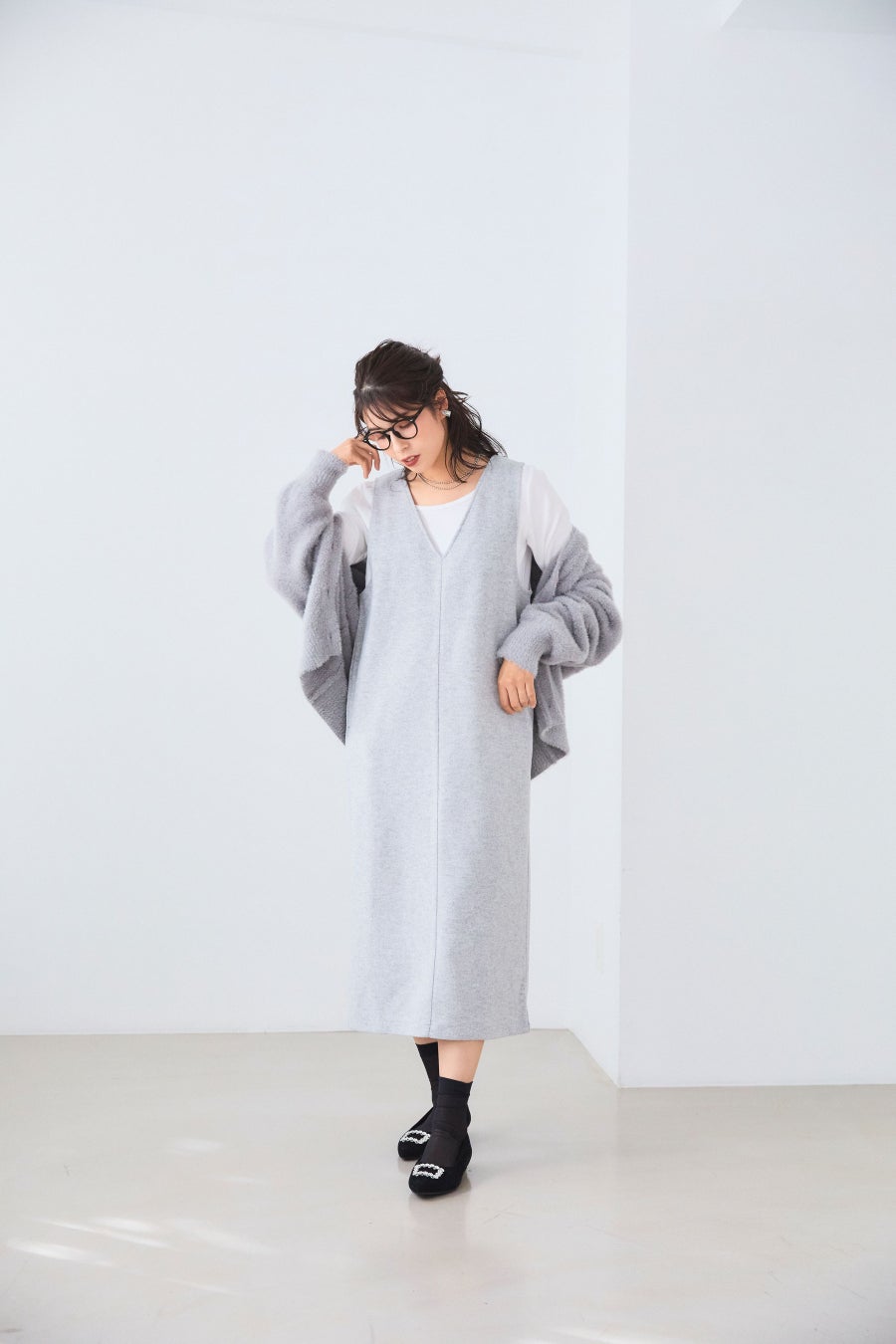 「シンプルなグレーのワントーンコーデも、ふわっとした表情のあるニットカーディガンを羽織れば、ほどよく甘見え。シンプルで落ち着いたカラーリングのコーディネートは、フェザーやウールライクといった温かみのある異素材コンビで抜かりなく」