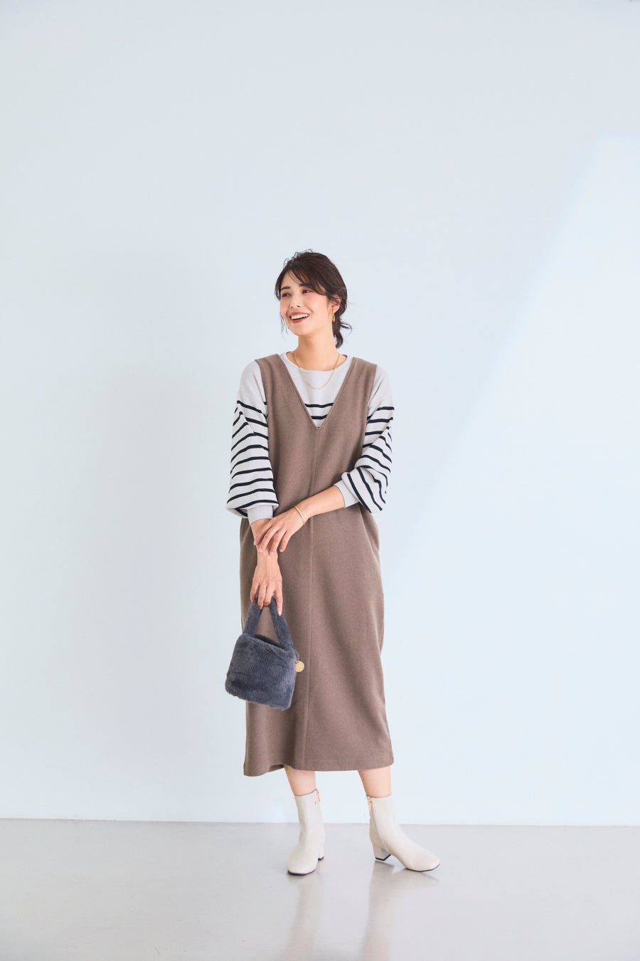 「習い事の送り迎えから外遊びまで、ママはいつだって大忙し。それでも明るく元気に過ごすママたちによく似合う、ブラウンのジャンパースカートとカジュアルボーダーの秋らしいコーデ 。ちょっぴり長め丈なのも動きやすさを重視するママにとってはポイントが高い」