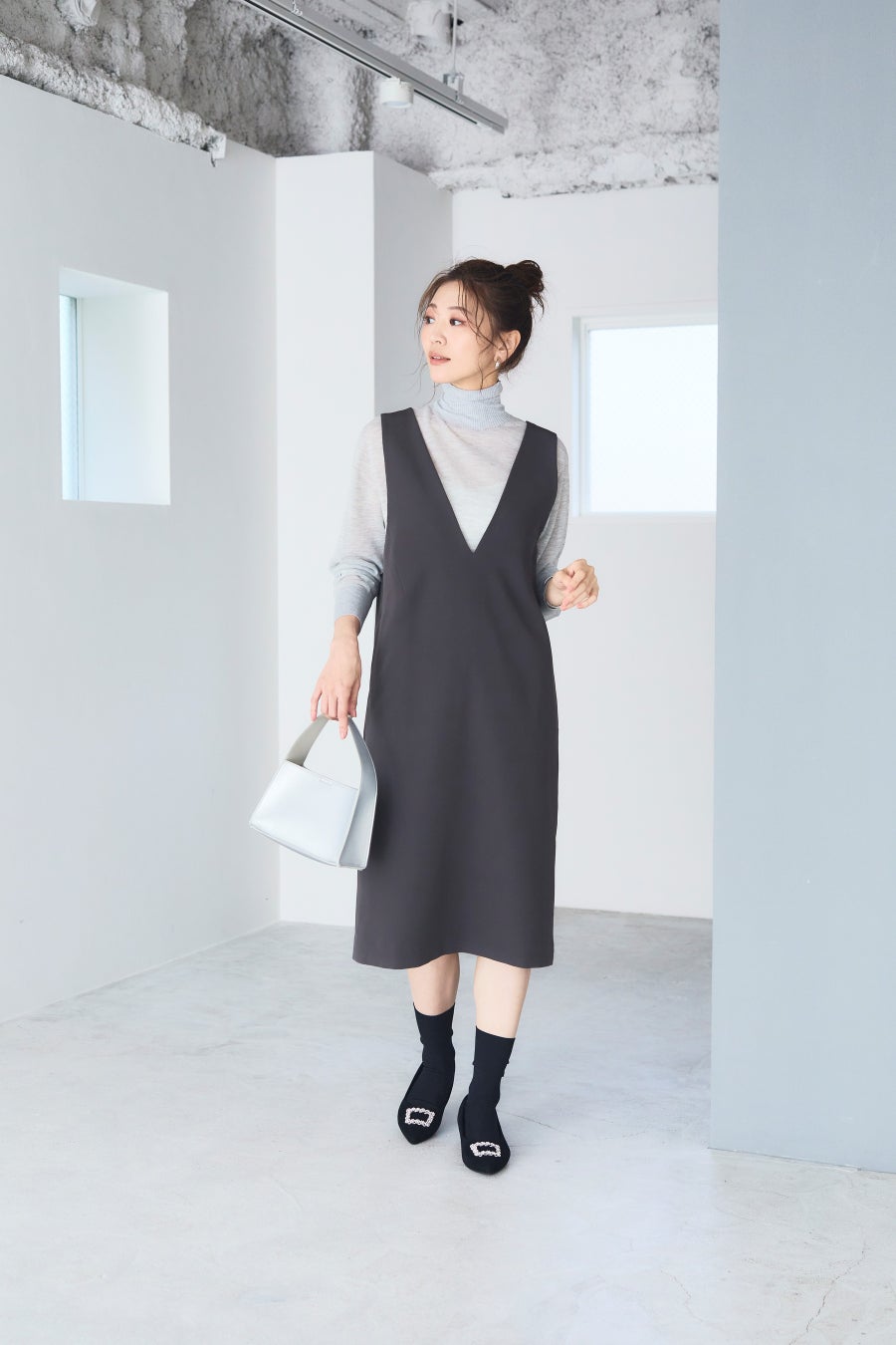 「淡いグレーのタートルネックとチャコールグレーのVネックジャンパースカートをレイヤードした、シンプルながらも上品なスタイル。落ち着いたカラーの組み合わせが、大人の余裕を感じさせます。どんな予定にも対応できる万能さで、1日をスマートに乗り切るための味方コーデです」