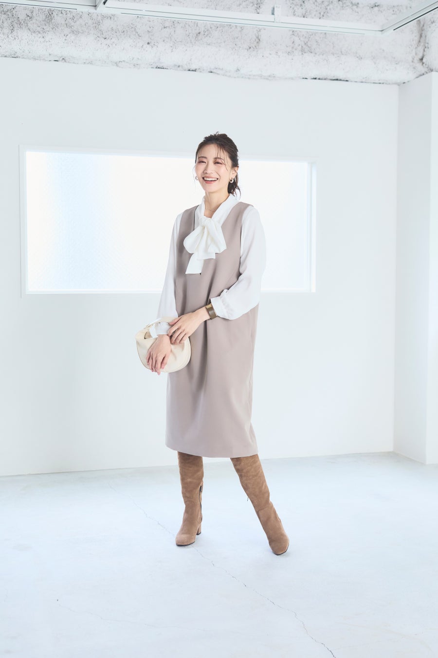 「優しいベージュのジャンパースカートには、大きめのリボンタイがエレガントなブラウスを。足元に同色のロングブーツを合わせれば、全体が秋カラーにまとまってシックな印象に 。さりげない上品さを引き立てるコーディネートなら、七五三などのハレの日やオフィスシーンなど幅広く活躍してくれます」