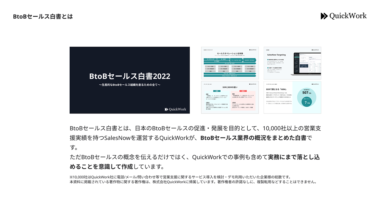 QuickWorkでは「社会の生産性を底上げする。」をビジョンに掲げ、創業以来テクノロジーによって生産性を改善できる領域にフォーカスして、事業に取り組んできました。少子高齢化が現実のものになり、労働力不足が深刻な社会問題になりつつある今、業務における効率化に取り組み、その上で効果の最大化を目指すことは、企業のこれからを考える上でとても重要なことだと感じています。今回の「BtoBセールス白書2022」が、多くの企業様の営業活動の一助になれば心から嬉しく思います。想いを込めてつくりました。ぜひご活用ください。
