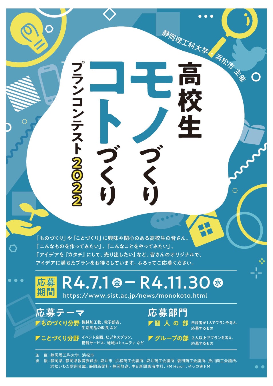 浜松市では、起業・創業支援事業の一環として、次世代の地域経済の担い手育成を目的に、静岡理工科大学との共同主催により「高校生モノづくり・コトづくりプランコンテスト2022」を開催します。本コンテストは、今回が10回目の開催となります。