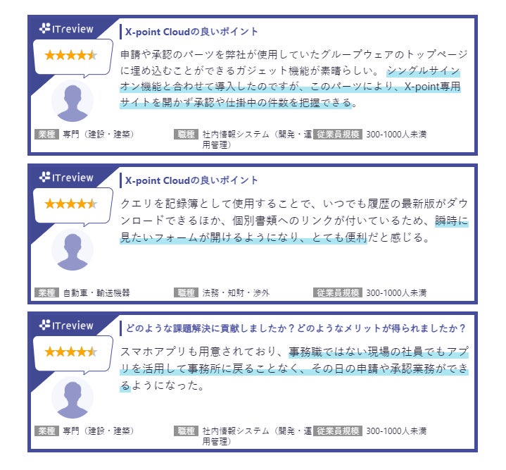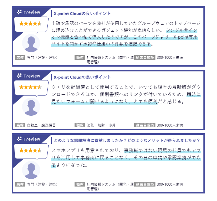 スマホアプリでどこからでも簡単に申請承認が可能な点や、柔軟にクエリを活用できる点などをご評価いただき、高い満足度につながりました。今回の集計期間内において投稿いただいたレビューの一部をご紹介いたします。