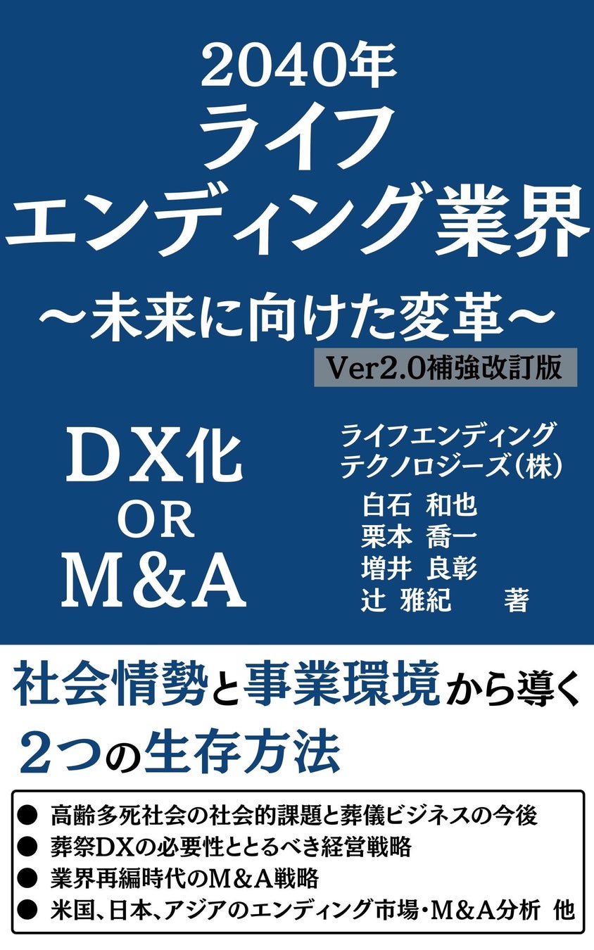 2020年5月30日に出版し、Amazon「ビジネスマナー」ジャンルにて8位を獲得した「2040年葬儀業界~未来に向けた変革~」のVer2.0補強改訂版として、米国、日本、アジアのエンディング市場・M&A分析も加筆しております。