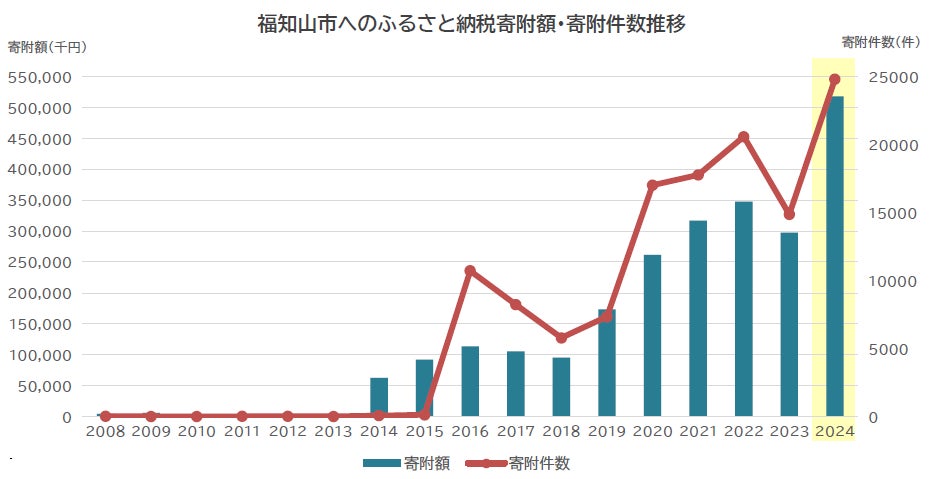 福知山市では、2017年からふるさと納税制度を開始し、着実に寄附額を積み上げてきました。2024年度には過去最高額となる5.18億となり、初めて5億円を突破しました。全国各地の皆様からいただいた大切なご寄附は、今後の市政運営に活用していきます。